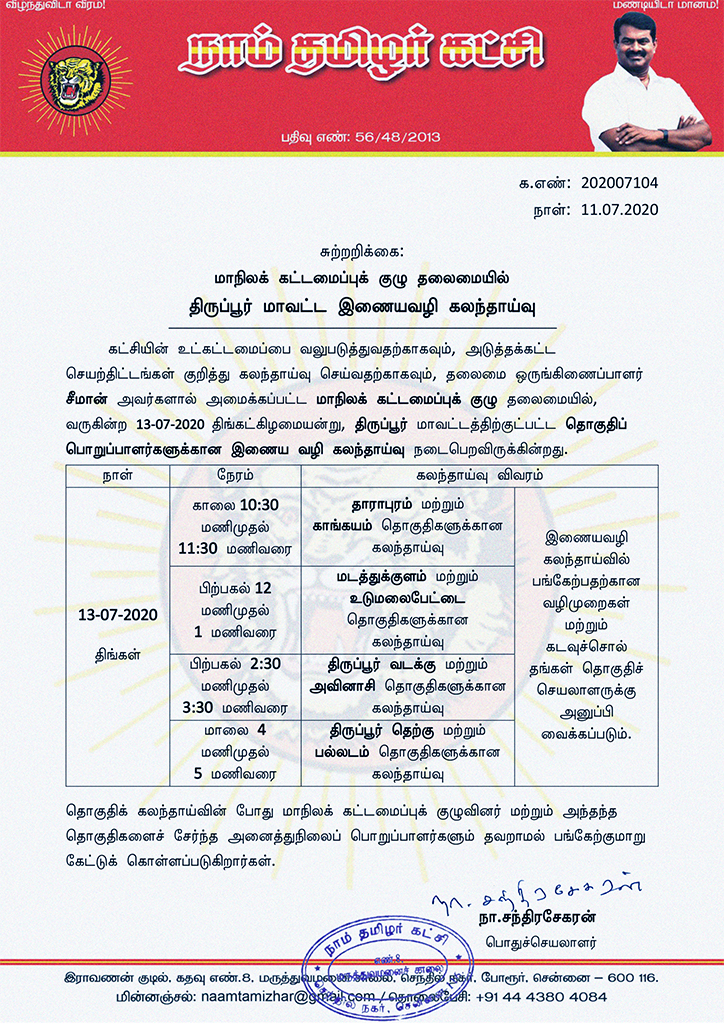 கட்சியின் உட்கட்டமைப்பை வலுபடுத்துவதற்காகவும், அடுத்தக்கட்ட செயற்திட்டங்கள் குறித்து கலந்தாய்வு செய்வதற்காகவும், தலைமை ஒருங்கிணைப்பாளர் சீமான் அவர்களால் அமைக்கப்பட்ட மாநிலக் கட்டமைப்புக் குழு தலைமையில், வருகின்ற 13-07-2020 திங்கட்கிழமையன்று, திருப்பூர் மாவட்டத்திற்குட்பட்ட தொகுதிப் பொறுப்பாளர்களுக்கான இணைய வழி கலந்தாய்வு நடைபெறவிருக்கின்றது.