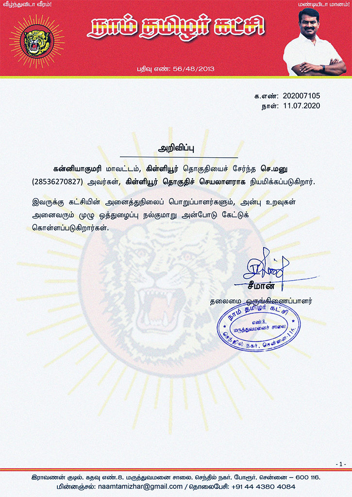 இவருக்கு கட்சியின் அனைத்துநிலைப் பொறுப்பாளர்களும், அன்பு உறவுகள் அனைவரும் முழு ஒத்துழைப்பு நல்குமாறு அன்போடு கேட்டுக் கொள்ளப்படுகிறார்கள்.