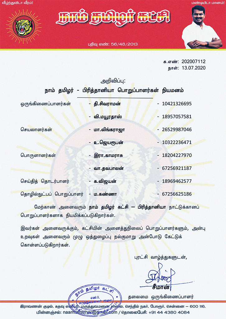 தலைமை அறிவிப்பு: நாம் தமிழர் – பிரித்தானியா பொறுப்பாளர்கள் நியமனம்
