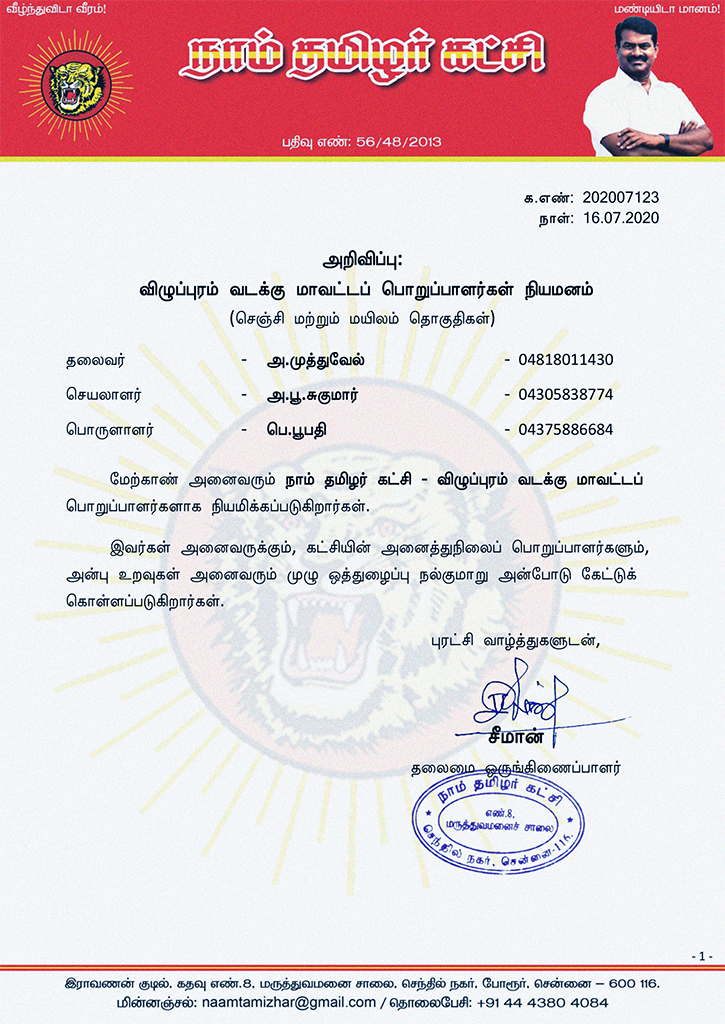 மேற்காண் அனைவரும் நாம் தமிழர் கட்சி – விழுப்புரம் வடக்கு மாவட்டப் பொறுப்பாளர்களாக நியமிக்கப்படுகிறார்கள்.