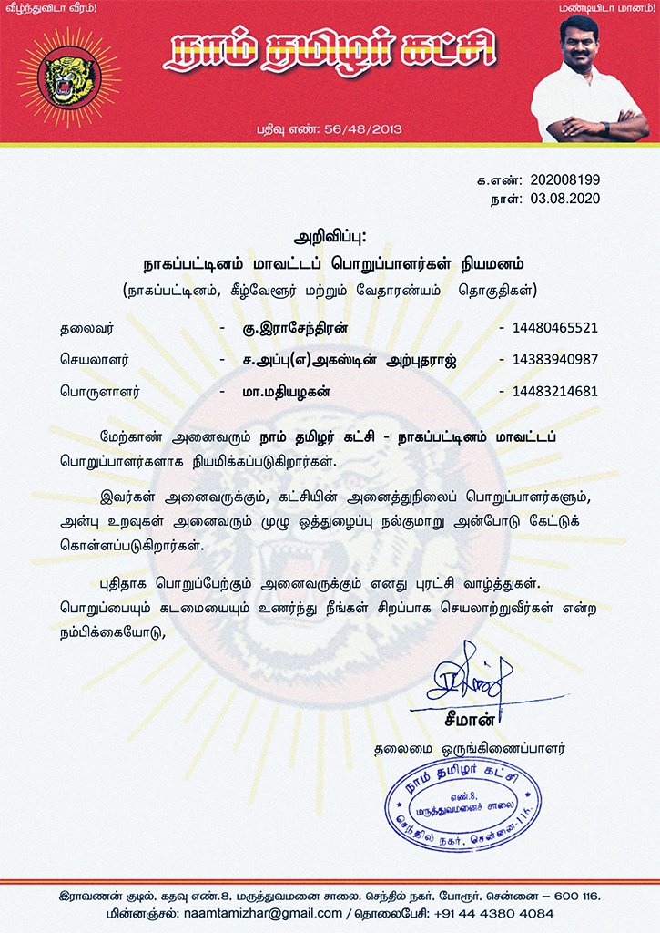 மேற்காண் அனைவரும் நாம் தமிழர் கட்சி – நாகப்பட்டினம் மாவட்டப் பொறுப்பாளர்களாக நியமிக்கப்படுகிறார்கள்.