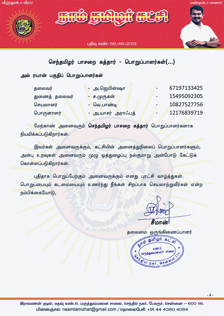 மேற்காண் அனைவரும் செந்தமிழர் பாசறை கத்தார் பொறுப்பாளர்களாக நியமிக்கப்படுகிறார்கள்.