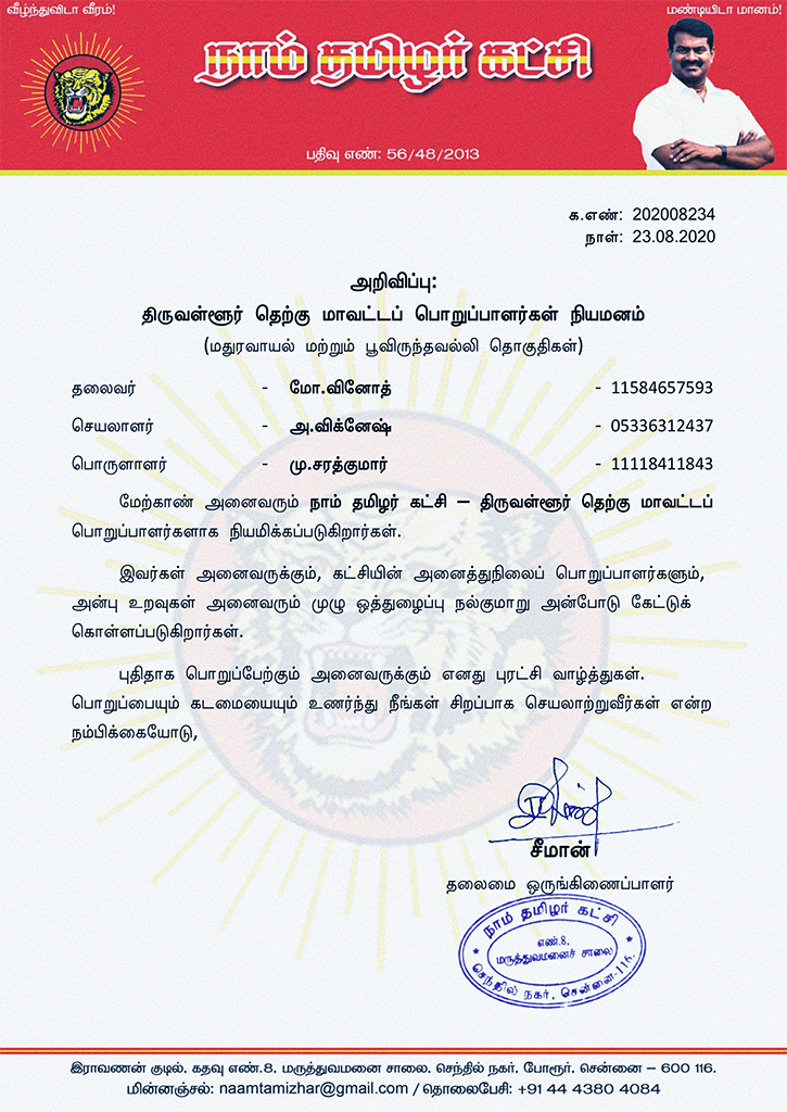 மேற்காண் அனைவரும் நாம் தமிழர் கட்சி – திருவள்ளூர் தெற்கு மாவட்டப் பொறுப்பாளர்களாக நியமிக்கப்படுகிறார்கள்.