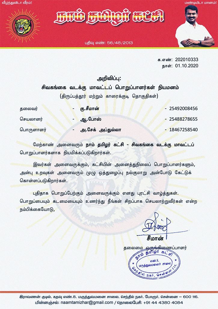 மேற்காண் அனைவரும் நாம் தமிழர் கட்சி – சிவகங்கை வடக்கு மாவட்டப் பொறுப்பாளர்களாக நியமிக்கப்படுகிறார்கள்.