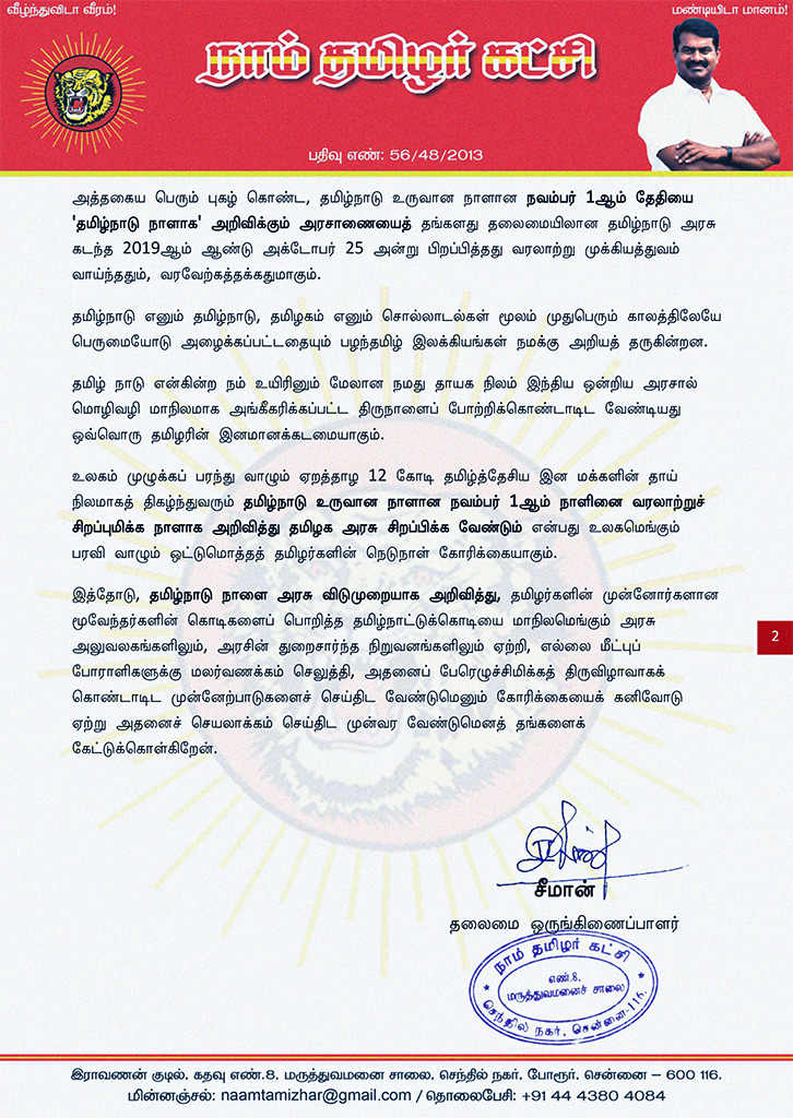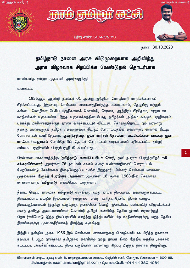 உலகம் முழுக்கப் பரந்து வாழும் ஏறத்தாழ 12 கோடி தமிழ்த்தேசிய இன மக்களின் தாய் நிலமாகத் திகழ்ந்துவரும் தமிழ்நாடு உருவான நாளான நவம்பர் 1ஆம் நாளினை வரலாற்றுச் சிறப்புமிக்க நாளாக அறிவித்து தமிழக அரசு சிறப்பிக்க வேண்டும் என்பது உலகமெங்கும் பரவி வாழும் ஒட்டுமொத்தத் தமிழர்களின் நெடுநாள் கோரிக்கையாகும்.
