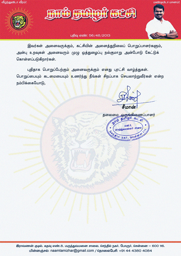 இவர்கள் அனைவருக்கும், கட்சியின் அனைத்துநிலைப் பொறுப்பாளர்களும், அன்பு உறவுகள் அனைவரும் முழு ஒத்துழைப்பு நல்குமாறு அன்போடு கேட்டுக் கொள்ளப்படுகிறார்கள்.
