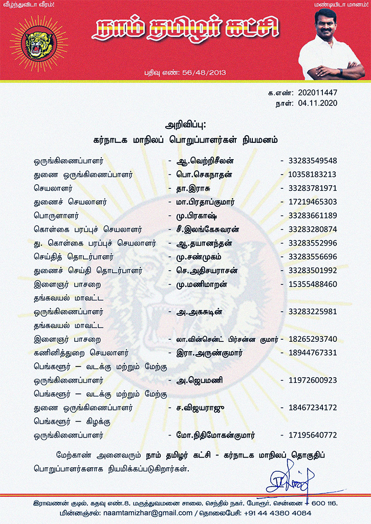 மேற்காண் அனைவரும் நாம் தமிழர் கட்சி – கர்நாடக மாநிலப் தொகுதிப் பொறுப்பாளர்களாக நியமிக்கப்படுகிறார்கள்.