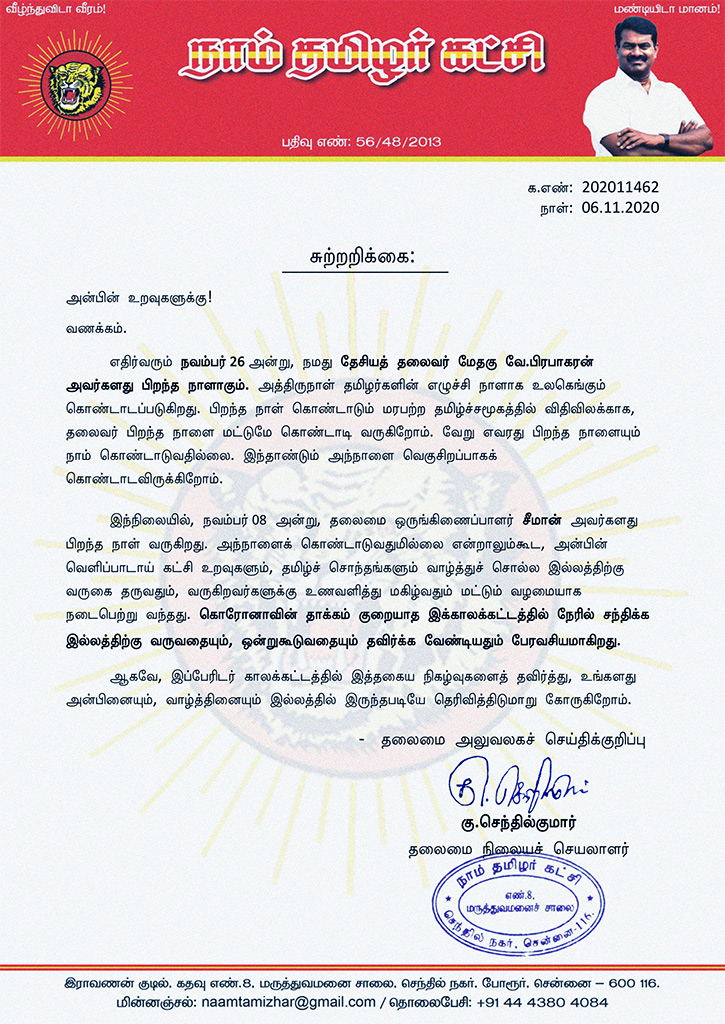இந்நிலையில், நவம்பர் 08 அன்று, தலைமை ஒருங்கிணைப்பாளர் சீமான் அவர்களது பிறந்த நாள் வருகிறது. அந்நாளைக் கொண்டாடுவதுமில்லை என்றாலும்கூட, அன்பின் வெளிப்பாடாய் கட்சி உறவுகளும், தமிழ்ச் சொந்தங்களும் வாழ்த்துச் சொல்ல இல்லத்திற்கு வருகை தருவதும், வருகிறவர்களுக்கு உணவளித்து மகிழ்வதும் மட்டும் வழமையாக நடைபெற்று வந்தது. கொரோனாவின் தாக்கம் குறையாத இக்காலக்கட்டத்தில் நேரில் சந்திக்க இல்லத்திற்கு வருவதையும், ஒன்றுகூடுவதையும் தவிர்க்க வேண்டியதும் பேரவசியமாகிறது.