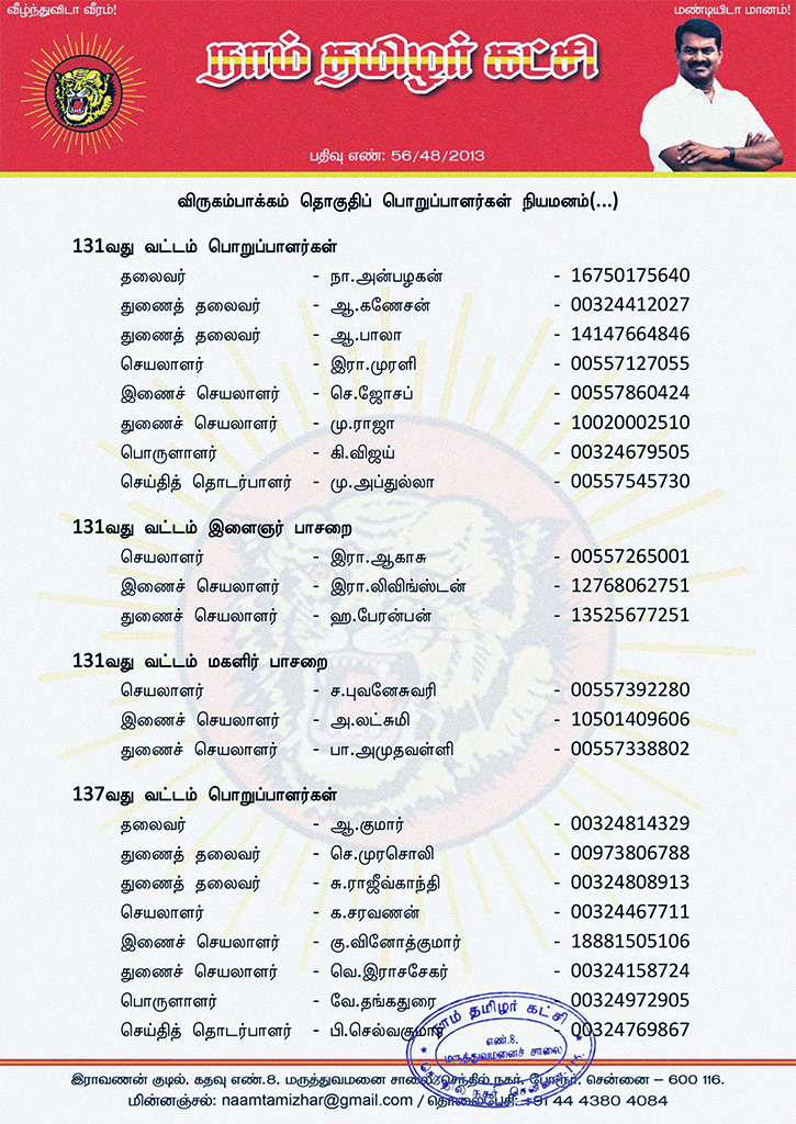 மேற்காண் அனைவரும் நாம் தமிழர் கட்சி – விருகம்பாக்கம் தொகுதிப் பொறுப்பாளர்களாக நியமிக்கப்படுகிறார்கள்.