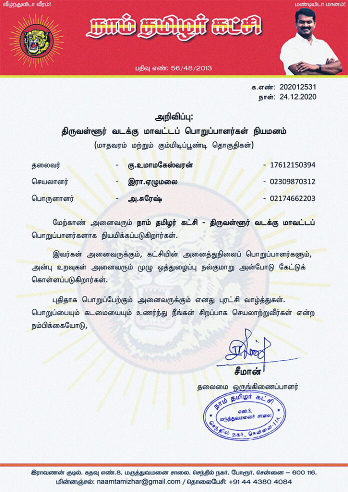 மேற்காண் அனைவரும் நாம் தமிழர் கட்சி – திருவள்ளூர் வடக்கு மாவட்டப் பொறுப்பாளர்களாக நியமிக்கப்படுகிறார்கள்.