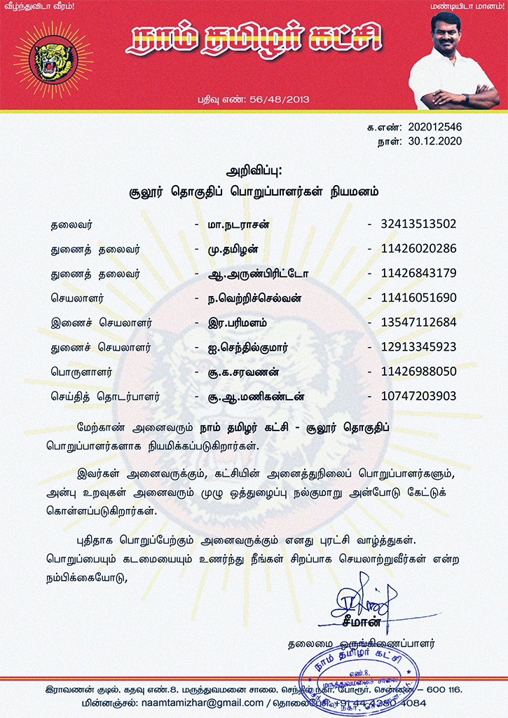 மேற்காண் அனைவரும் நாம் தமிழர் கட்சி – சிங்காநல்லூர் தொகுதிப் பொறுப்பாளர்களாக நியமிக்கப்படுகிறார்கள்.