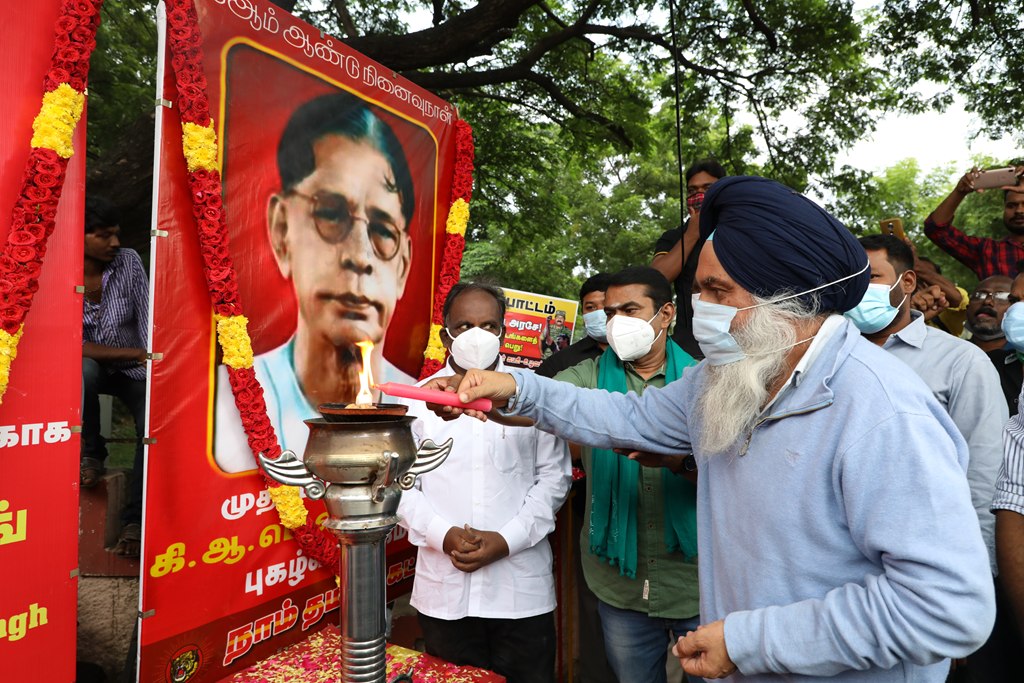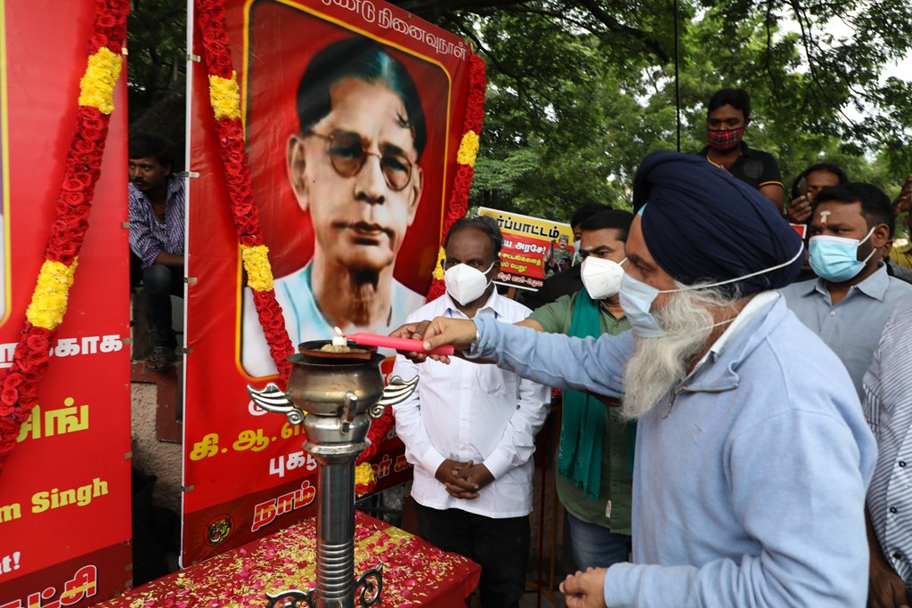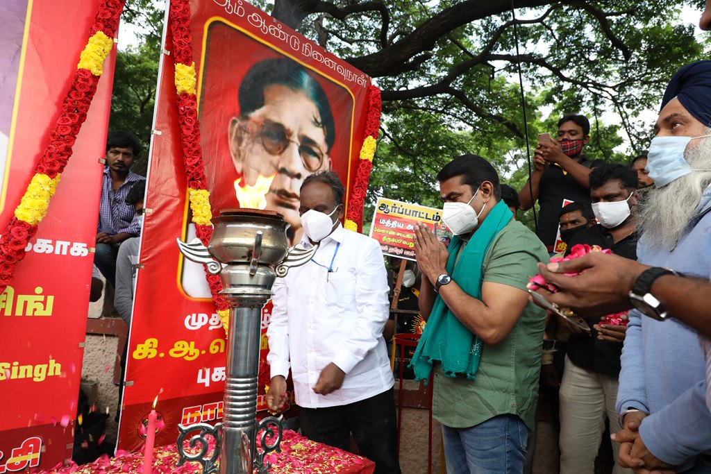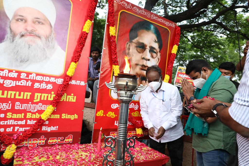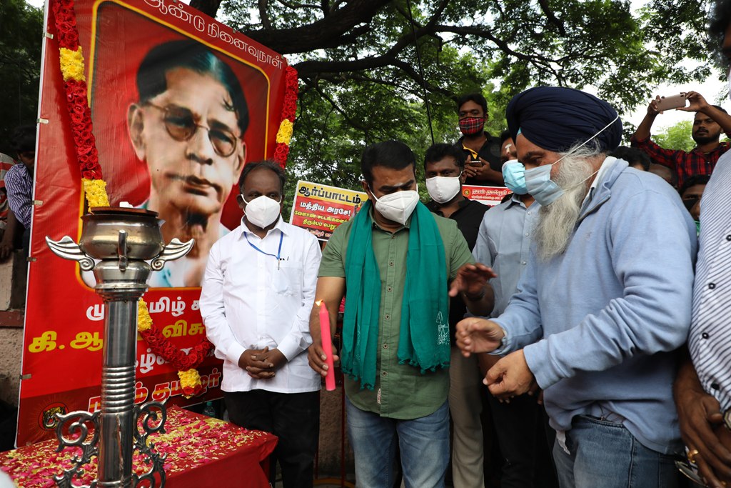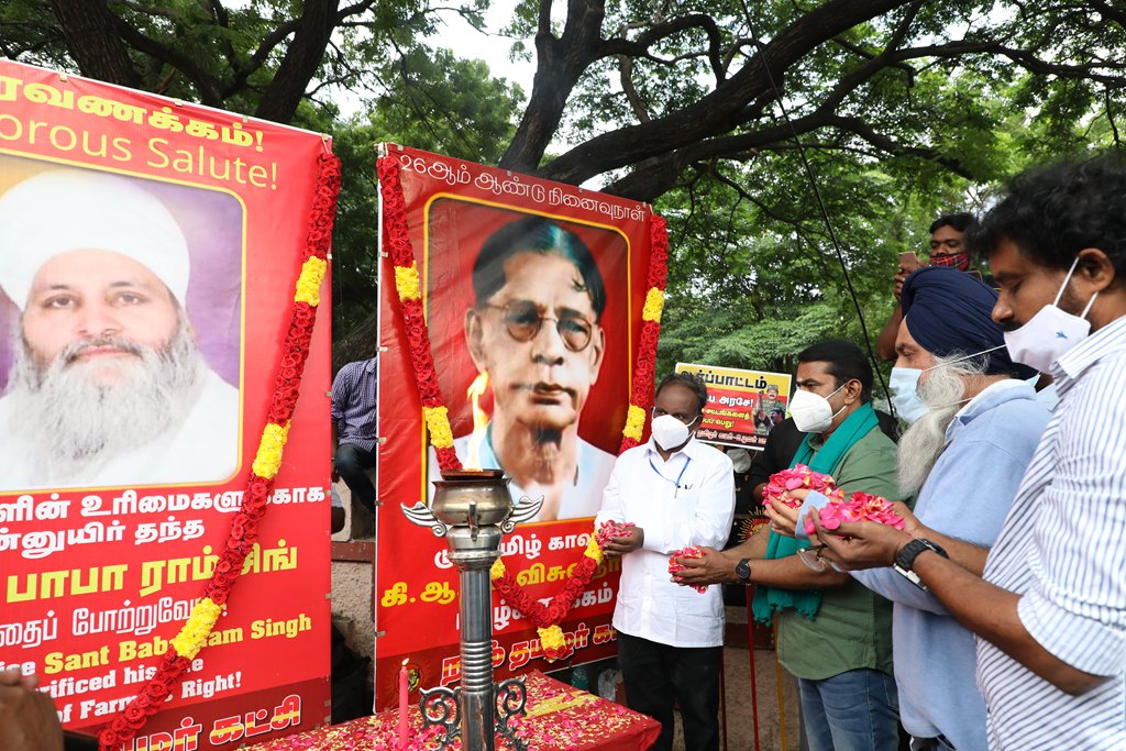 முன்னதாக முத்தமிழ் காவலர் ஐயா கி.ஆ.பெ.விசுவநாதம் அவர்களின் 26ஆம் ஆண்டு நினைவுநாளையொட்டி அவரது திருவுருவப்படத்திற்கு, சீமான் அவர்கள் மலர் வணக்கம் செலுத்தினார். அதனைத்தொடர்ந்து டெல்லியில் நடைபெற்றுவரும் விவசாயிகளின் தொடர் போராட்டத்தில் பங்கேற்று உயிரிழந்த விவசாயிகளின் ஈகத்தை நினைவுகூர்ந்து, விவசாயிகளின் உரிமைகளுக்காகத் தன்னுயிர் தந்த சந்த் பாபா ராம் சிங் அவர்களின் திருவுருவப்படத்திற்கு, திரு அஜய்பால் சிங் பிரார் அவர்கள் ஈகைச் சுடரேற்றி வீரவணக்கம் செலுத்தினார்.