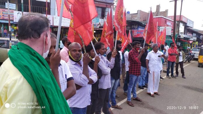நீலகிரி மாவட்டம் கூடலூர் சட்டமன்றத்தொகுதி நெல்லியாளம் நகரம் பந்தலூர் கடைவீதியில் 09-12-20 மத்திய அரசு கொண்டு வந்துள்ள வேளாண் மசோதாக்களை திரும்ப பெற வலியுறுத்தியும்,டில்லியில் போராடி வரும் வேளாண் பெருங்குடிகளுக்கு ஆதரவு தெரிவித்து கண்டன ஆர்ப்பாட்டம் நடைபெற்றது.