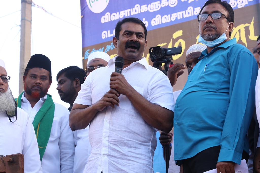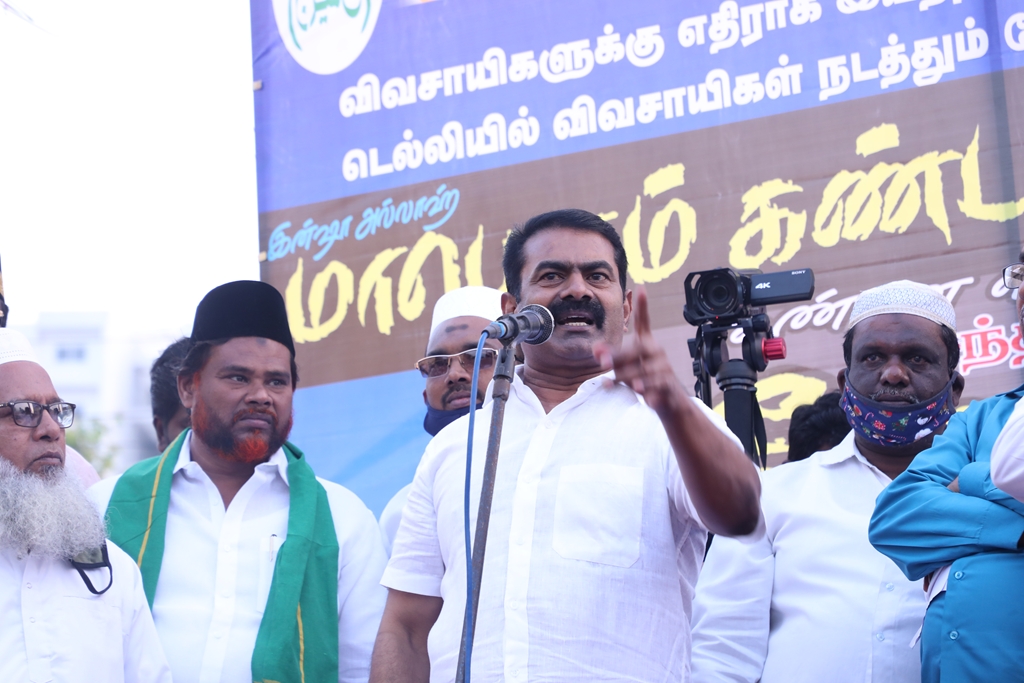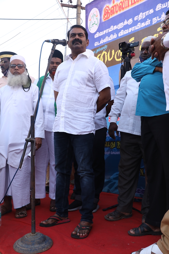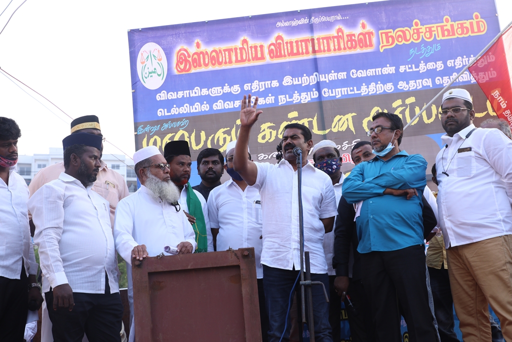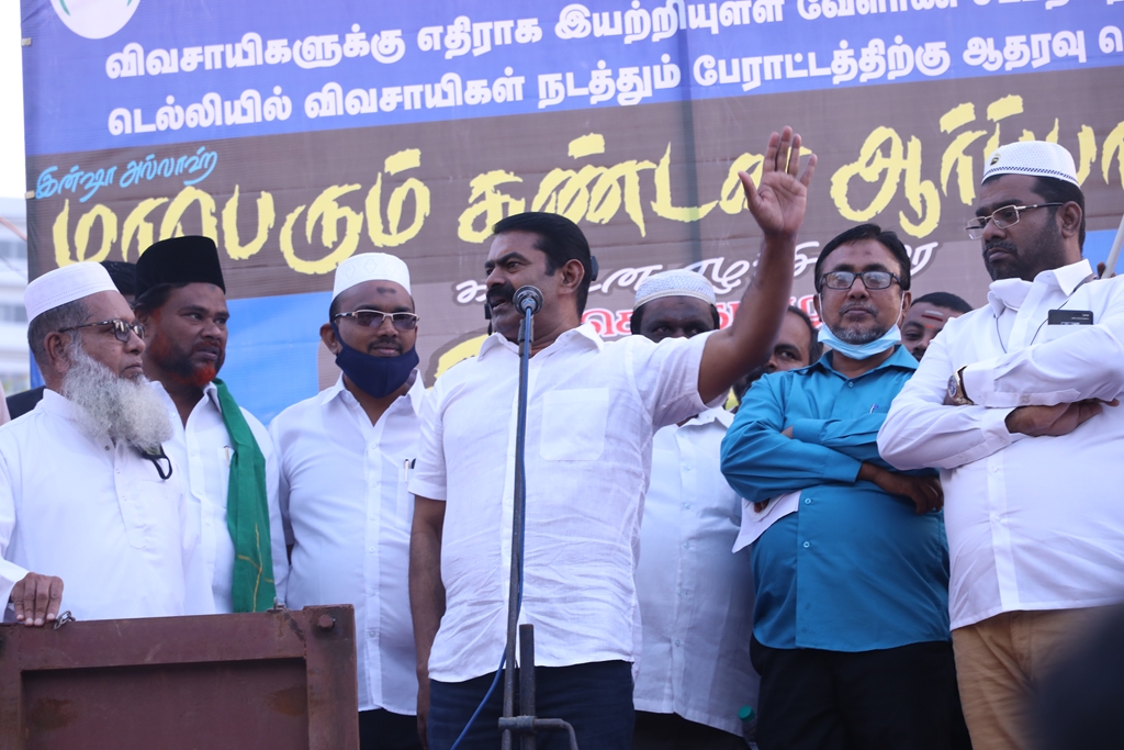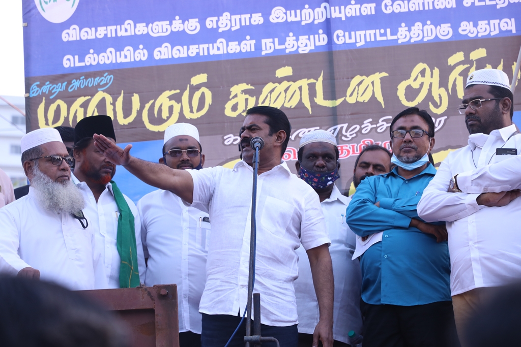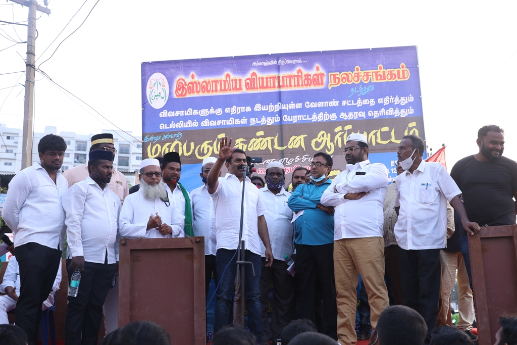 விவசாயிகளின் நலனுக்கும் உரிமைகளுக்கும் எதிராக மத்திய அரசு இயற்றியுள்ள வேளாண் சட்டங்களை எதிர்த்தும், வேளாண் சட்டங்களைத் திரும்பப்பெற வலியுறுத்தி டெல்லியில் நடைபெற்றுவரும் விவசாயிகள் தொடர் போராட்டத்திற்கு ஆதரவு தெரிவித்தும், செங்கல்பட்டு ஐக்கிய ஜாமாஅத் ஒருங்கிணைப்பில் இஸ்லாமிய வியாபாரிகள் நலச்சங்கம் சார்பில் 11-12-2020 அன்று மாலை 05 மணியளவில், பள்ளிக்கரணை மாநகராட்சி அலுவலகம் எதிரில் நடைபெற்ற மாபெரும் கண்டன ஆர்ப்பாட்டத்தில் நாம் தமிழர் கட்சியின் தலைமை ஒருங்கிணைப்பாளர் சீமான் அவர்கள் பங்கேற்று கண்டனவுரையாற்றினார்.