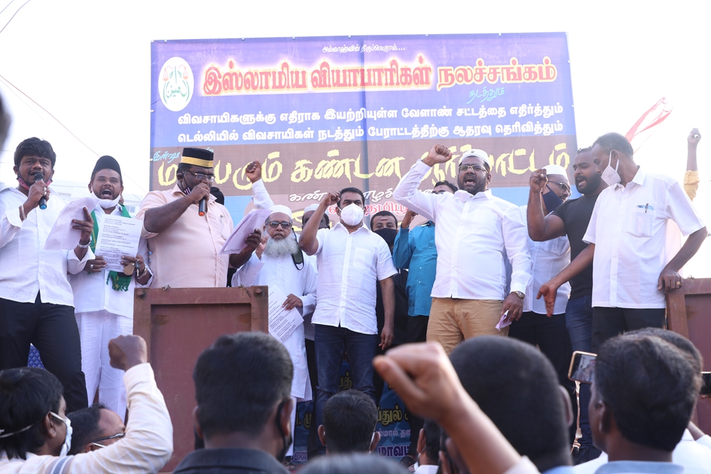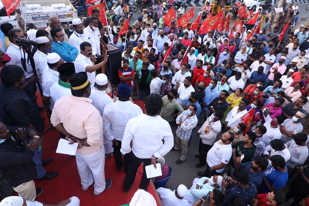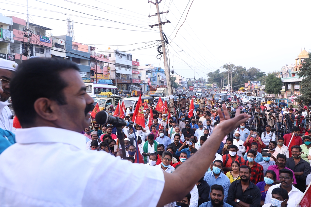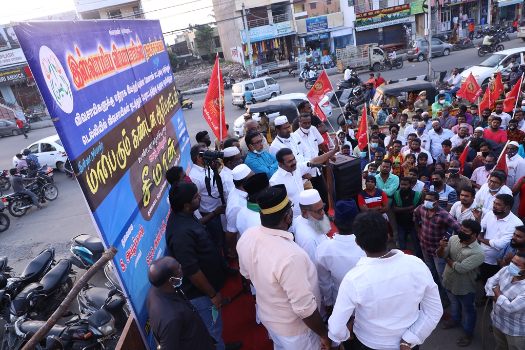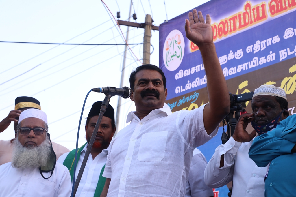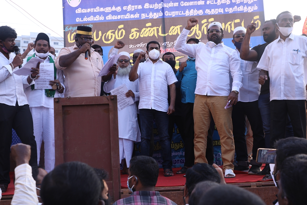 விவசாயிகளின் நலனுக்கும் உரிமைகளுக்கும் எதிராக மத்திய அரசு இயற்றியுள்ள வேளாண் சட்டங்களை எதிர்த்தும், வேளாண் சட்டங்களைத் திரும்பப்பெற வலியுறுத்தி டெல்லியில் நடைபெற்றுவரும் விவசாயிகள் தொடர் போராட்டத்திற்கு ஆதரவு தெரிவித்தும், செங்கல்பட்டு ஐக்கிய ஜாமாஅத் ஒருங்கிணைப்பில் இஸ்லாமிய வியாபாரிகள் நலச்சங்கம் சார்பில் 11-12-2020 அன்று மாலை 05 மணியளவில், பள்ளிக்கரணை மாநகராட்சி அலுவலகம் எதிரில் நடைபெற்ற மாபெரும் கண்டன ஆர்ப்பாட்டத்தில் நாம் தமிழர் கட்சியின் தலைமை ஒருங்கிணைப்பாளர் சீமான் அவர்கள் பங்கேற்று கண்டனவுரையாற்றினார்.