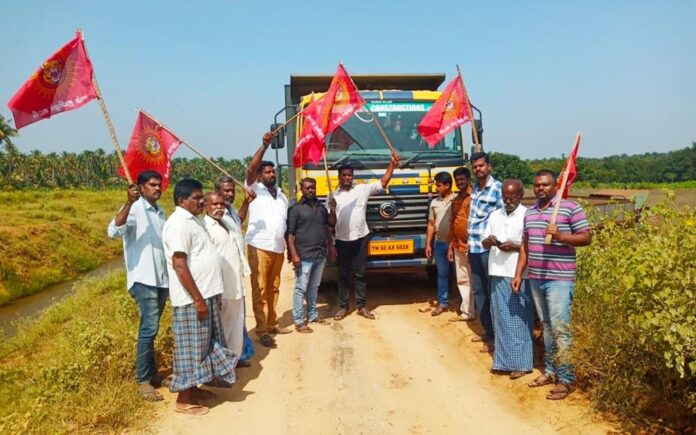 கோரிக்கையை ஏற்று) முறைகேடாக விளைநிலங்களில் மணல் அள்ளிய வாகனங்களை  நாம் தமிழர் கட்சியினர் சிறைபிடித்தனர்