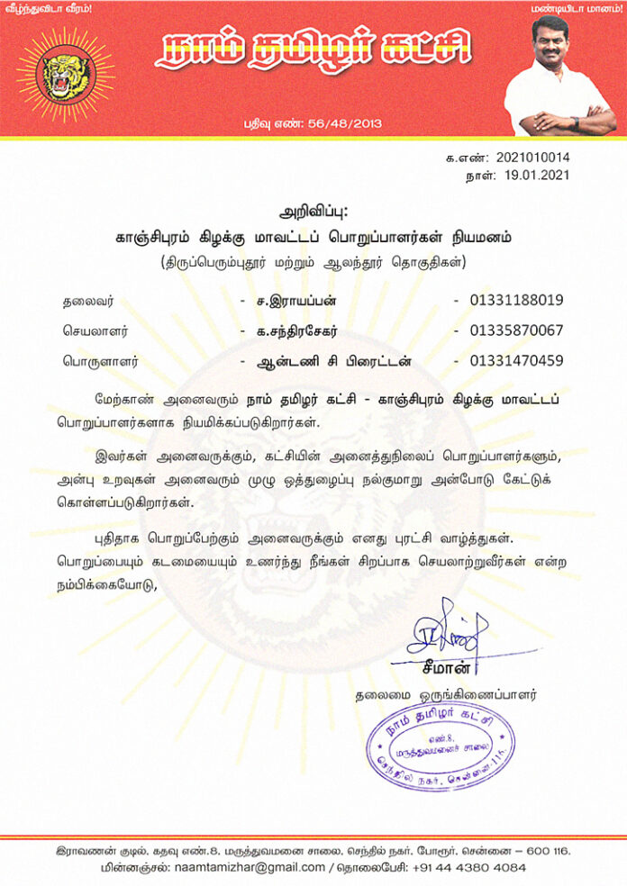 மேற்காண் அனைவரும் நாம் தமிழர் கட்சி – காஞ்சிபுரம் கிழக்கு மாவட்டப் பொறுப்பாளர்களாக நியமிக்கப்படுகிறார்கள்.