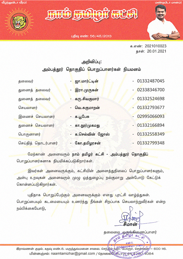 மேற்காண் அனைவரும் நாம் தமிழர் கட்சி – அம்பத்தூர் தொகுதிப் பொறுப்பாளர்களாக நியமிக்கப்படுகிறார்கள்.