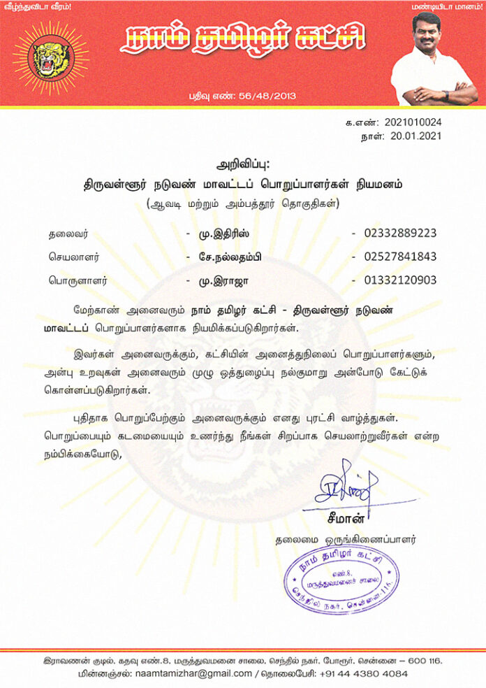 மேற்காண் அனைவரும் நாம் தமிழர் கட்சி – திருவள்ளூர் நடுவண் மாவட்டப் பொறுப்பாளர்களாக நியமிக்கப்படுகிறார்கள்.