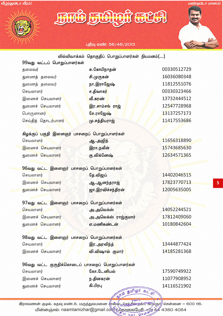 மேற்காண் அனைவரும் நாம் தமிழர் கட்சி – வில்லிவாக்கம் தொகுதிப் பொறுப்பாளர்களாக நியமிக்கப்படுகிறார்கள்.