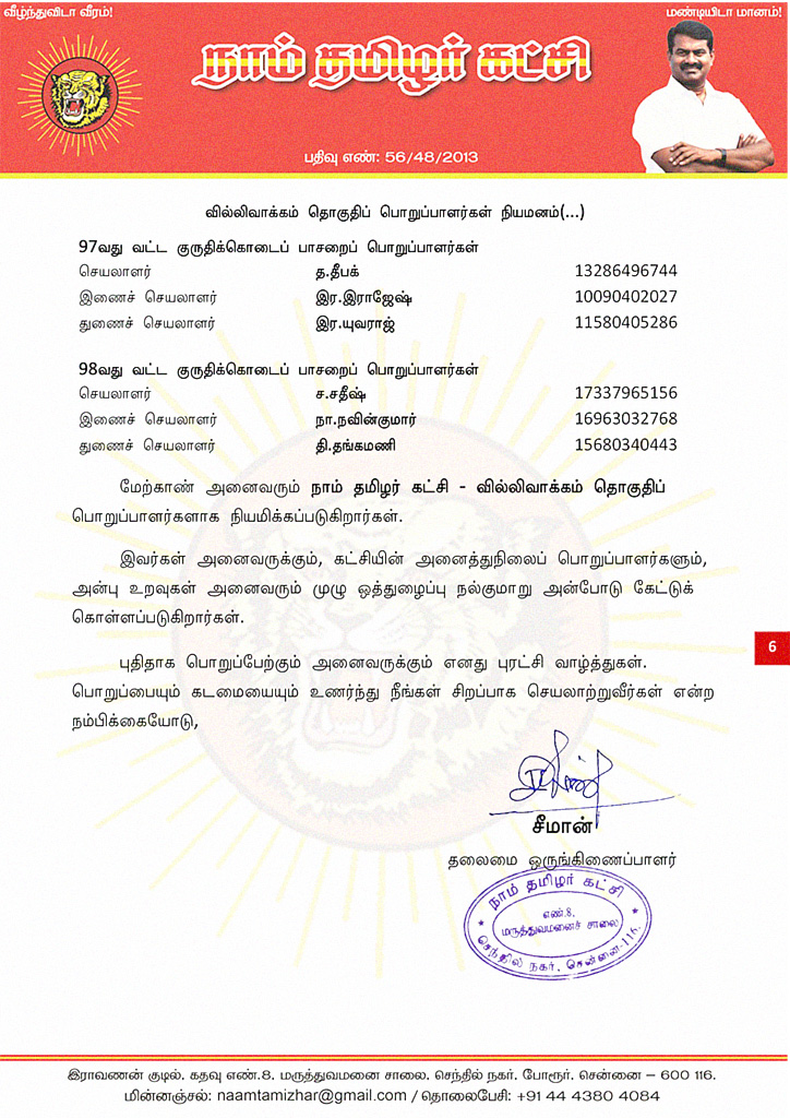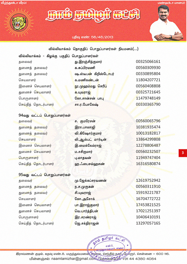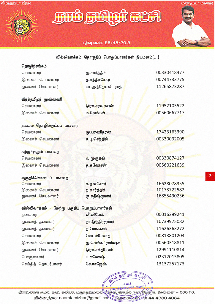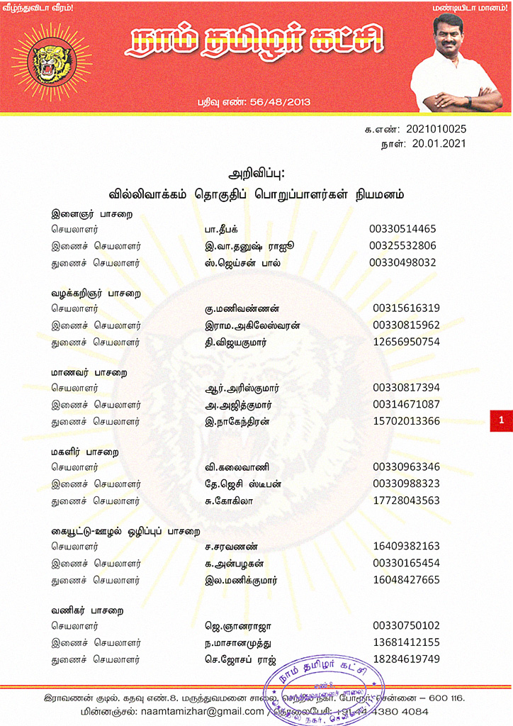 மேற்காண் அனைவரும் நாம் தமிழர் கட்சி – வில்லிவாக்கம் தொகுதிப் பொறுப்பாளர்களாக நியமிக்கப்படுகிறார்கள்.