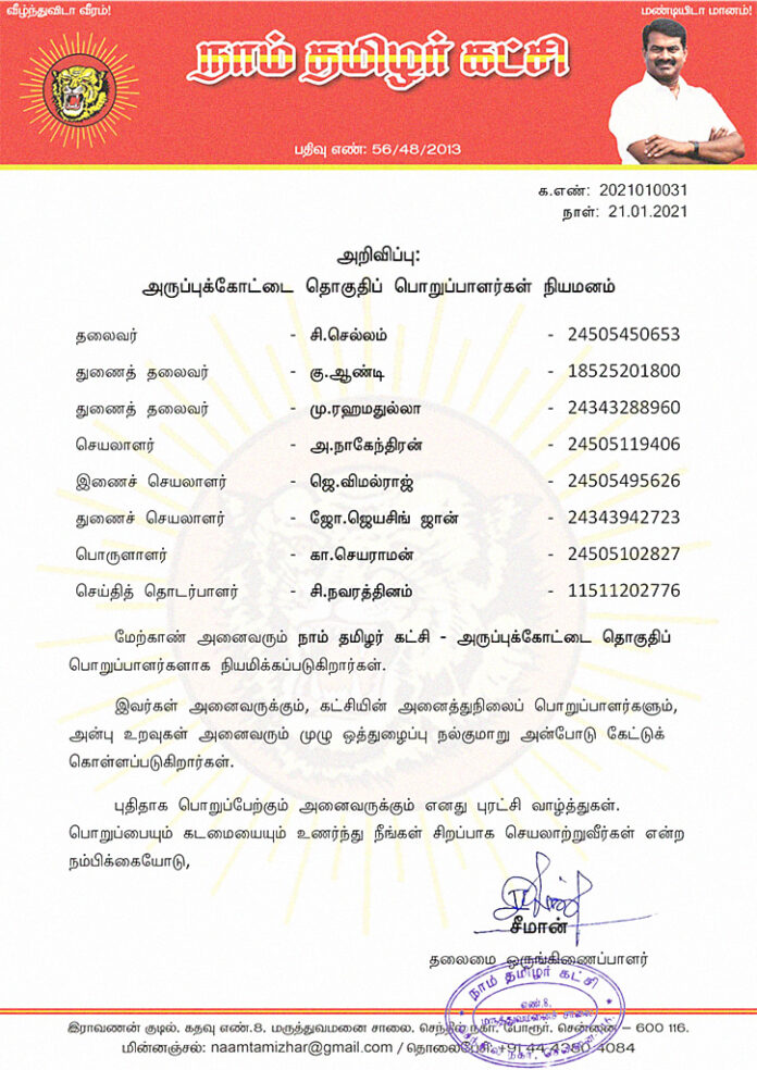 மேற்காண் அனைவரும் நாம் தமிழர் கட்சி – அருப்புக்கோட்டை தொகுதிப் பொறுப்பாளர்களாக நியமிக்கப்படுகிறார்கள்.