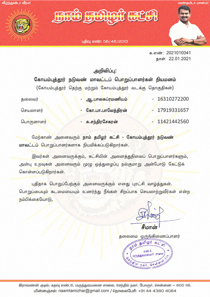 மேற்காண் அனைவரும் நாம் தமிழர் கட்சி – கோயம்புத்தூர் நடுவண் மாவட்டப் பொறுப்பாளர்களாக நியமிக்கப்படுகிறார்கள்.