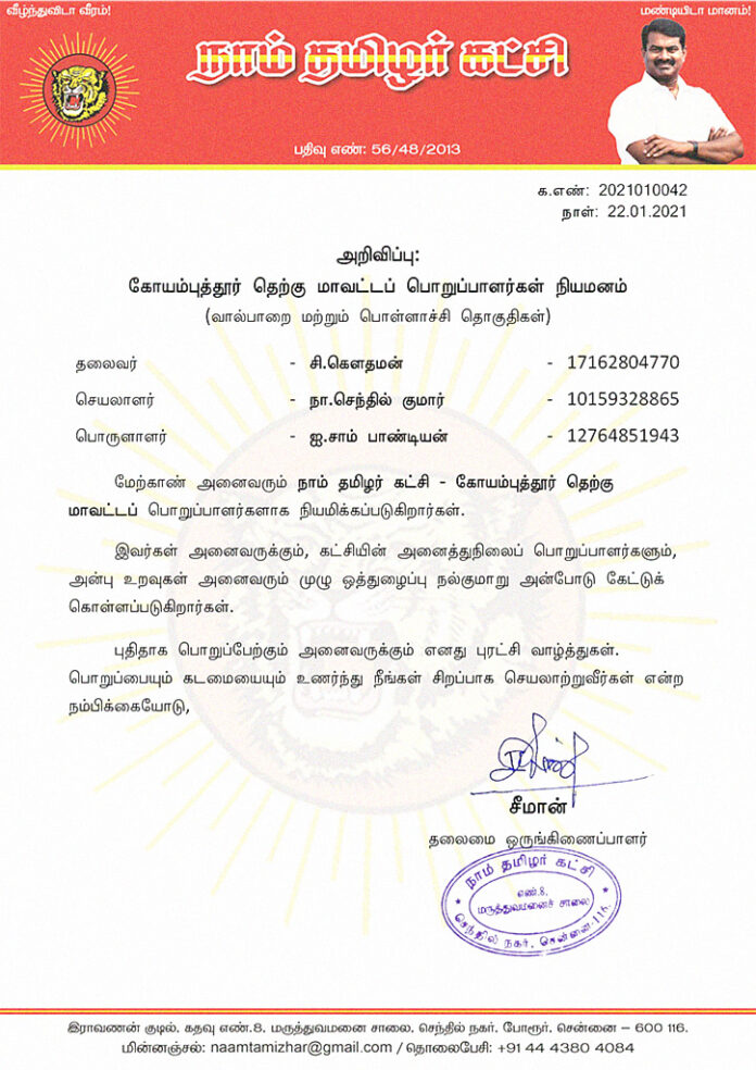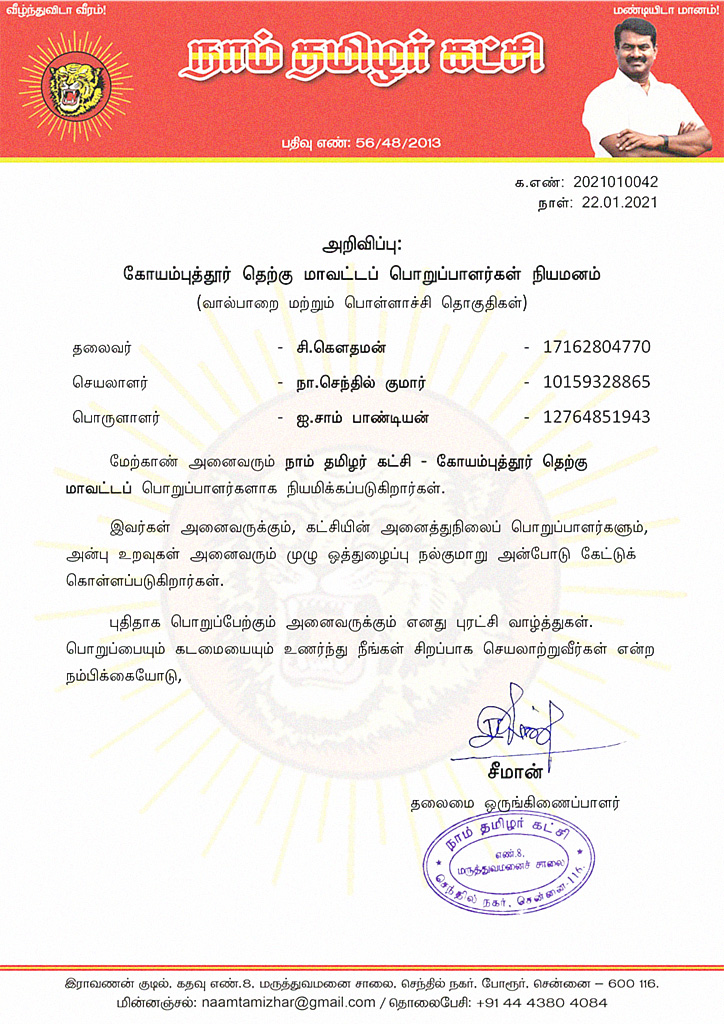 மேற்காண் அனைவரும் நாம் தமிழர் கட்சி – கோயம்புத்தூர் தெற்கு மாவட்டப் பொறுப்பாளர்களாக நியமிக்கப்படுகிறார்கள்.