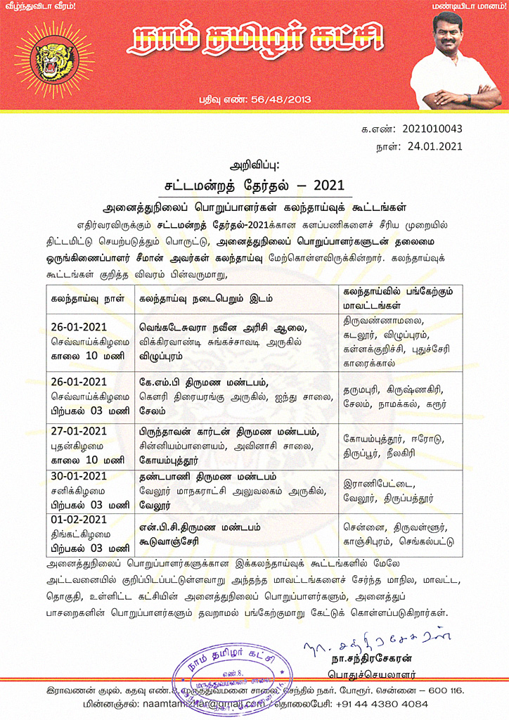 எதிர்வரவிருக்கும் சட்டமன்றத் தேர்தல்-2021க்கான களப்பணிகளைச் சீரிய முறையில் திட்டமிட்டு செயற்படுத்தும் பொருட்டு, அனைத்துநிலைப் பொறுப்பாளர்களுடன் தலைமை ஒருங்கிணைப்பாளர் சீமான் அவர்கள் கலந்தாய்வு மேற்கொள்ளவிருக்கின்றார். கலந்தாய்வுக் கூட்டங்கள் குறித்த விவரம் பின்வருமாறு,