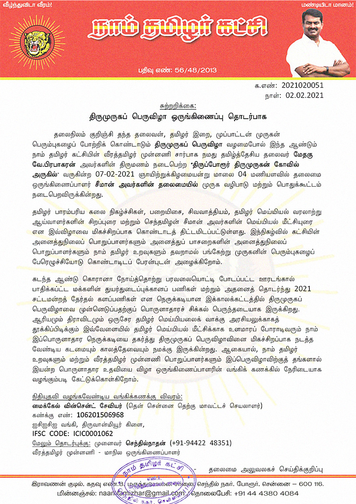 கடந்த ஆண்டு கொரானா நோய்த்தொற்று பரவலையொட்டி போடப்பட்ட ஊரடங்கால் பாதிக்கப்ட்ட மக்களின் துயர்துடைப்புக்கானப் பணிகள் மற்றும் அதனைத் தொடர்ந்து 2021 சட்டமன்றத் தேர்தல் களப்பணிகள் என நெருக்கடியான இக்காலக்கட்டத்தில் திருமுருகப் பெருவிழாவை முன்னெடுப்பதற்குப் பொருளாதாரச் சிக்கல் பெருந்தடையாக இருக்கிறது. ஆரியமும் திராவிடமும் ஒருசேர தமிழர் மெய்யியலைக் வாக்கு அரசியலுக்காகத் தூக்கிப்பிடிக்கும் இவ்வேளையில் தமிழர் மெய்யியல் மீட்சிக்காக உளமாரப் போராடிவரும் நாம் இப்பொருளாதார நெருக்கடியை தகர்த்து திருமுருகப் பெருவிழாவினை மிகச்சிறப்பாக நடத்த வேண்டிய கடமையும் காலத்தேவையும் நமக்கு இருக்கின்றது. ஆகையால், நாம் தமிழர் உறவுகளும் மற்றும் வீரத்தமிழர் முன்னணி பொறுப்பாளர்களும் இப்பெருவிழாவிற்குத் தங்களால் இயன்ற பொருளாதார உதவியை விழா ஒருங்கிணைப்பாளரின் வங்கிக் கணக்கில் நேரிடையாக வழங்கும்படி கேட்டுக்கொள்கிறோம்.