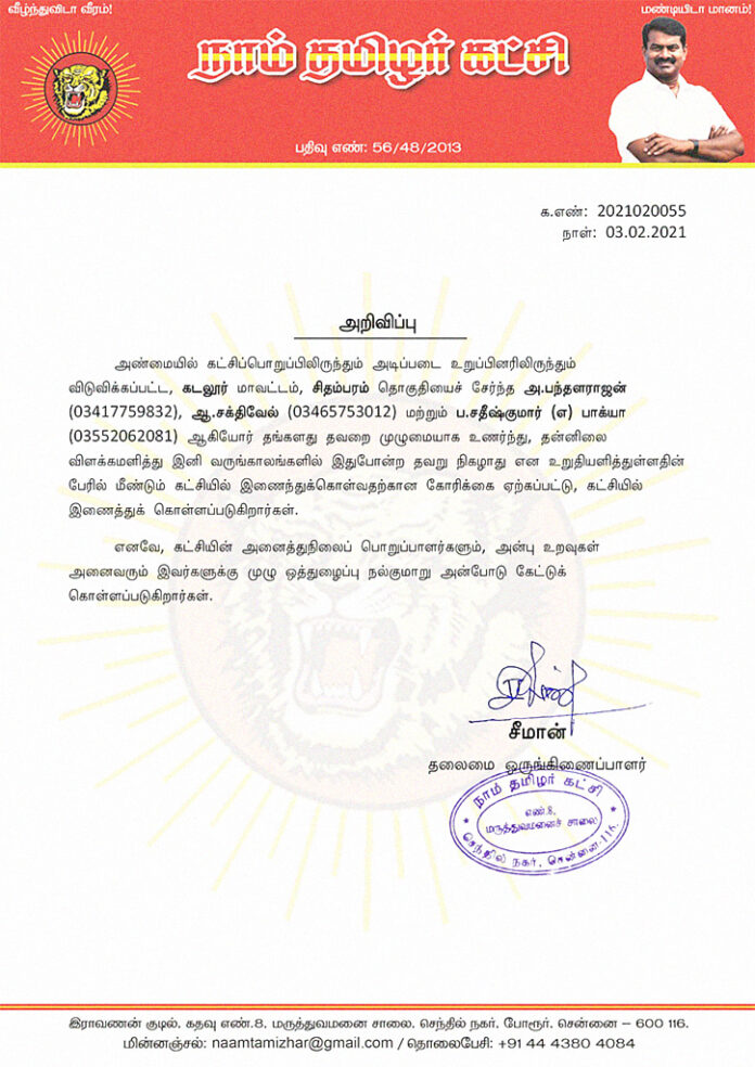 அண்மையில் கட்சிப்பொறுப்பிலிருந்தும் அடிப்படை உறுப்பினரிலிருந்தும் விடுவிக்கப்பட்ட, கடலூர் மாவட்டம், சிதம்பரம் தொகுதியைச் சேர்ந்த அ.பந்தளராஜன் (03417759832), ஆ.சக்திவேல் (03465753012) மற்றும் ப.சதீஷ்குமார் (எ) பாக்யா (03552062081) ஆகியோர் தங்களது தவறை முழுமையாக உணர்ந்து, தன்னிலை விளக்கமளித்து இனி வருங்காலங்களில் இதுபோன்ற தவறு நிகழாது என உறுதியளித்துள்ளதின் பேரில் மீண்டும் கட்சியில் இணைந்துக்கொள்வதற்கான கோரிக்கை ஏற்கப்பட்டு, கட்சியில் இணைத்துக் கொள்ளப்படுகிறார்கள்.