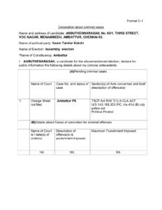வருகின்ற ஏப்ரல் 6 அன்று நடைபெறவிருக்கின்ற தமிழகசட்டமன்றப் பொதுத்தேர்தலில்  நாம் தமிழர் கட்சி சார்பாக கரும்பு விவசாயி சின்னத்தில் போட்டியிடுகின்ற அம்பத்தூர்  சட்டமன்றத்தொகுதி வேட்பாளரின்  குற்றப்பின்னணி  குறித்த விவரங்கள் கீழே உள்ள கோப்பில் இணைக்கப்பட்டுள்ளது.