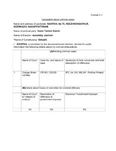 வருகின்ற ஏப்ரல் 6 அன்று நடைபெறவிருக்கின்ற தமிழகசட்டமன்றப் பொதுத்தேர்தலில் நாம் தமிழர் கட்சி சார்பாக கரும்பு விவசாயி சின்னத்தில் போட்டியிடுகின்ற சீர்காழி சட்டமன்றத்தொகுதி வேட்பாளரின் குற்றப்பின்னணி குறித்த விவரங்கள் கீழே உள்ள கோப்பில் இணைக்கப்பட்டுள்ளது.