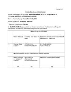 வருகின்ற ஏப்ரல் 6 அன்று நடைபெறவிருக்கின்ற தமிழகசட்டமன்றப் பொதுத்தேர்தலில் நாம் தமிழர் கட்சி சார்பாக கரும்பு விவசாயி சின்னத்தில் போட்டியிடுகின்ற பர்கூர் சட்டமன்றத்தொகுதி வேட்பாளரின் குற்றப்பின்னணி குறித்த விவரங்கள் கீழே உள்ள கோப்பில் இணைக்கப்பட்டுள்ளது.