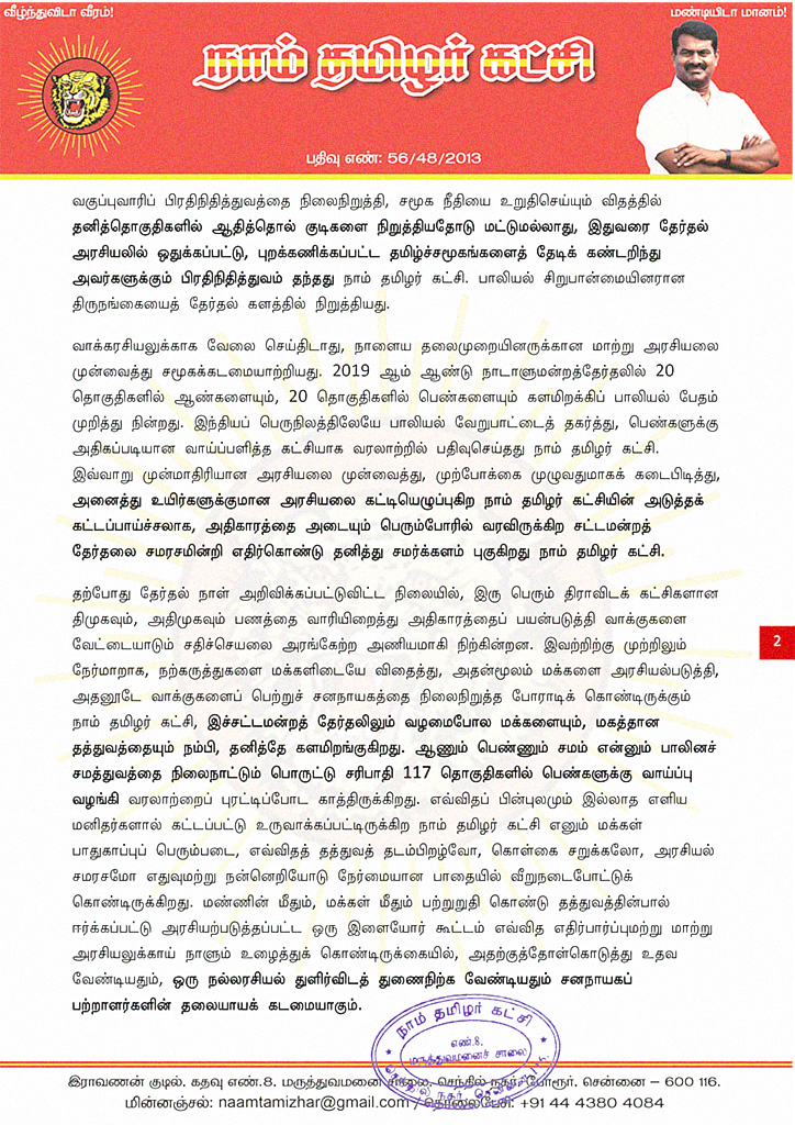 தற்போது தேர்தல் நாள் அறிவிக்கப்பட்டுவிட்ட நிலையில், இரு பெரும் திராவிடக் கட்சிகளான திமுகவும், அதிமுகவும் பணத்தை வாரியிறைத்து அதிகாரத்தைப் பயன்படுத்தி வாக்குகளை வேட்டையாடும் சதிச்செயலை அரங்கேற்ற அணியமாகி நிற்கின்றன. இவற்றிற்கு முற்றிலும் நேர்மாறாக, நற்கருத்துகளை மக்களிடையே விதைத்து, அதன்மூலம் மக்களை அரசியல்படுத்தி, அதனூடே வாக்குகளைப் பெற்றுச் சனநாயகத்தை நிலைநிறுத்த போராடிக் கொண்டிருக்கும் நாம் தமிழர் கட்சி, இச்சட்டமன்றத் தேர்தலிலும் வழமைபோல மக்களையும், மகத்தான தத்துவத்தையும் நம்பி, தனித்தே களமிறங்குகிறது. ஆணும் பெண்ணும் சமம் என்னும் பாலினச் சமத்துவத்தை நிலைநாட்டும் பொருட்டு சரிபாதி 117 தொகுதிகளில் பெண்களுக்கு வாய்ப்பு வழங்கி வரலாற்றைப் புரட்டிப்போட காத்திருக்கிறது. எவ்விதப் பின்புலமும் இல்லாத எளிய மனிதர்களால் கட்டப்பட்டு உருவாக்கப்பட்டிருக்கிற நாம் தமிழர் கட்சி எனும் மக்கள் பாதுகாப்புப் பெரும்படை, எவ்விதத் தத்துவத் தடம்பிறழ்வோ, கொள்கை சறுக்கலோ, அரசியல் சமரசமோ எதுவுமற்று நன்னெறியோடு நேர்மையான பாதையில் வீறுநடைபோட்டுக் கொண்டிருக்கிறது. மண்ணின் மீதும், மக்கள் மீதும் பற்றுறுதி கொண்டு தத்துவத்தின்பால் ஈர்க்கப்பட்டு அரசியற்படுத்தப்பட்ட ஒரு இளையோர் கூட்டம் எவ்வித எதிர்பார்ப்புமற்று மாற்று அரசியலுக்காய் நாளும் உழைத்துக் கொண்டிருக்கையில், அதற்குத்தோள்கொடுத்து உதவ வேண்டியதும், ஒரு நல்லரசியல் துளிர்விடத் துணைநிற்க வேண்டியதும் சனநாயகப் பற்றாளர்களின் தலையாயக் கடமையாகும்.