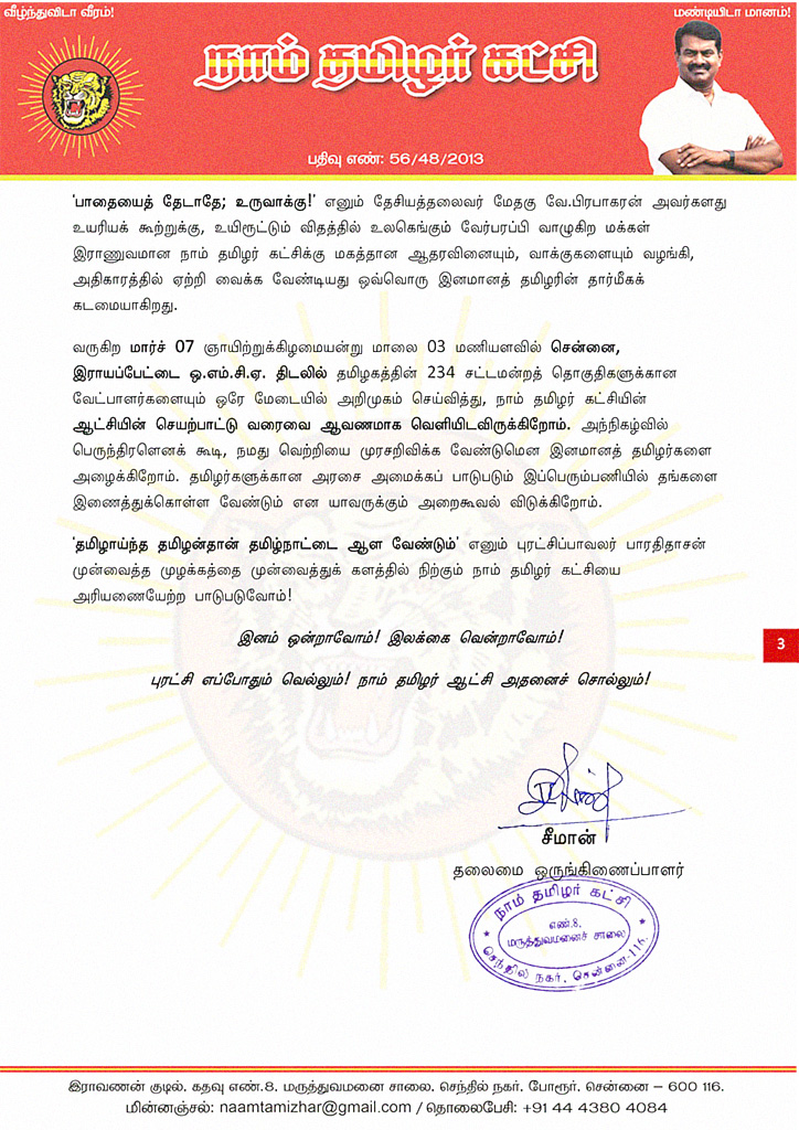 வருகிற மார்ச் 07 ஞாயிற்றுக்கிழமையன்று மாலை 03 மணியளவில் சென்னை, இராயப்பேட்டை ஒ.எம்.சி.ஏ. திடலில் தமிழகத்தின் 234 சட்டமன்றத் தொகுதிகளுக்கான வேட்பாளர்களையும் ஒரே மேடையில் அறிமுகம் செய்வித்து, நாம் தமிழர் கட்சியின் ஆட்சியின் செயற்பாட்டு வரைவை ஆவணமாக வெளியிடவிருக்கிறோம். அந்நிகழ்வில் பெருந்திரளெனக் கூடி, நமது வெற்றியை முரசறிவிக்க வேண்டுமென இனமானத் தமிழர்களை அழைக்கிறோம். தமிழர்களுக்கான அரசை அமைக்கப் பாடுபடும் இப்பெரும்பணியில் தங்களை இணைத்துக்கொள்ள வேண்டும் என யாவருக்கும் அறைகூவல் விடுக்கிறோம்.