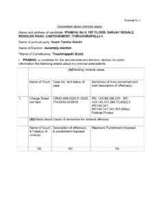 வருகின்ற ஏப்ரல் 6 அன்று நடைபெறவிருக்கின்ற தமிழகசட்டமன்றப் பொதுத்தேர்தலில் நாம் தமிழர் கட்சி சார்பாக கரும்பு விவசாயி சின்னத்தில் போட்டியிடுகின்ற திருச்சி கிழக்கு சட்டமன்றத்தொகுதி வேட்பாளரின் குற்றப்பின்னணி குறித்த விவரங்கள் கீழே உள்ள கோப்பில் இணைக்கப்பட்டுள்ளது.