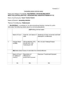 வருகின்ற ஏப்ரல் 6 அன்று நடைபெறவிருக்கின்ற தமிழகசட்டமன்றப் பொதுத்தேர்தலில் நாம் தமிழர் கட்சி சார்பாக கரும்பு விவசாயி சின்னத்தில் போட்டியிடுகின்ற வேதாரண்யம் சட்டமன்றத்தொகுதி வேட்பாளரின் வழக்கு குறித்த விவரங்கள் கீழே உள்ள கோப்பில் இணைக்கப்பட்டுள்ளது.