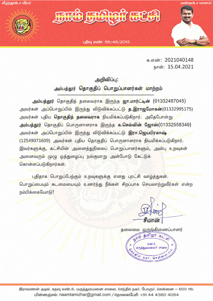 அம்பத்தூர் தொகுதித் தலைவராக இருந்த ஜா.மார்ட்டின் (01332487045) அவர்கள் அப்பொறுப்பில் இருந்து விடுவிக்கப்பட்டு த.இராஜமோகன்(01332995175) அவர்கள் புதிய தொகுதித் தலைவராக நியமிக்கப்படுகிறார். அதேபோன்று அம்பத்தூர் தொகுதிப் பொருளாளராக இருந்த க.செல்வின் ஜோஸ்(01332558349) அவர்கள் அப்பொறுப்பில் இருந்து விடுவிக்கப்பட்டு இரா.ஜெயபிரகாஷ் (12549071609) அவர்கள் புதிய தொகுதிப் பொருளாளராக நியமிக்கப்படுகிறார். இவர்களுக்கு, கட்சியின் அனைத்துநிலைப் பொறுப்பாளர்களும், அன்பு உறவுகள் அனைவரும் முழு ஒத்துழைப்பு நல்குமாறு அன்போடு கேட்டுக் கொள்ளப்படுகிறார்கள்.