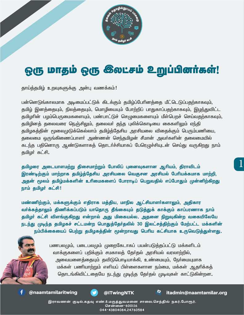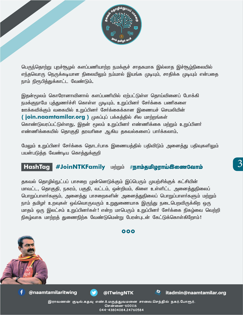 தகவல் தொழில்நுட்பப் பாசறை முன்னெடுக்கும் இப்பெரும் முயற்சிக்குக் கட்சியின் மாவட்ட, தொகுதி, நகரம், பகுதி, வட்டம், ஒன்றியம், கிளை உள்ளிட்ட அனைத்துநிலைப் பொறுப்பாளர்களும், அனைத்து பாசறைகளின் அனைத்துநிலைப் பொறுப்பாளர்களும் மற்றும் நாம் தமிழர் உறவுகள் ஒவ்வொருவரும் உறுதுணையாக இருந்து நடைபெறவிருக்கிற ஒரு மாதம் ஒரு இலட்சம் உறுப்பினர்கள்! என்ற மாபெரும் உறுப்பினர் சேர்க்கை நிகழ்வை வெற்றி நிகழ்வாக மாற்றத் துணைநிற்க வேண்டுமென்று பேரன்புடன் கேட்டுக்கொள்கிறோம்!