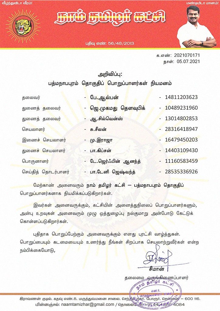 மேற்காண் அனைவரும் நாம் தமிழர் கட்சி – பத்மநாபபுரம் தொகுதிப் பொறுப்பாளர்களாக நியமிக்கப்படுகிறார்கள்.