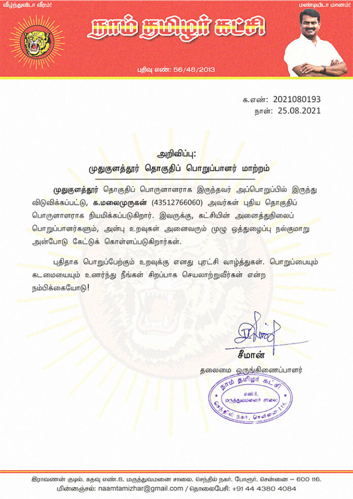 முதுகுளத்தூர் தொகுதிப் பொருளாளராக இருந்தவர் அப்பொறுப்பில் இருந்து விடுவிக்கப்பட்டு, க.மலைமுருகன் (43512766060) அவர்கள் புதிய தொகுதிப் பொருளாளராக நியமிக்கப்படுகிறார். இவருக்கு, கட்சியின் அனைத்துநிலைப் பொறுப்பாளர்களும், அன்பு உறவுகள் அனைவரும் முழு ஒத்துழைப்பு நல்குமாறு அன்போடு கேட்டுக் கொள்ளப்படுகிறார்கள்.