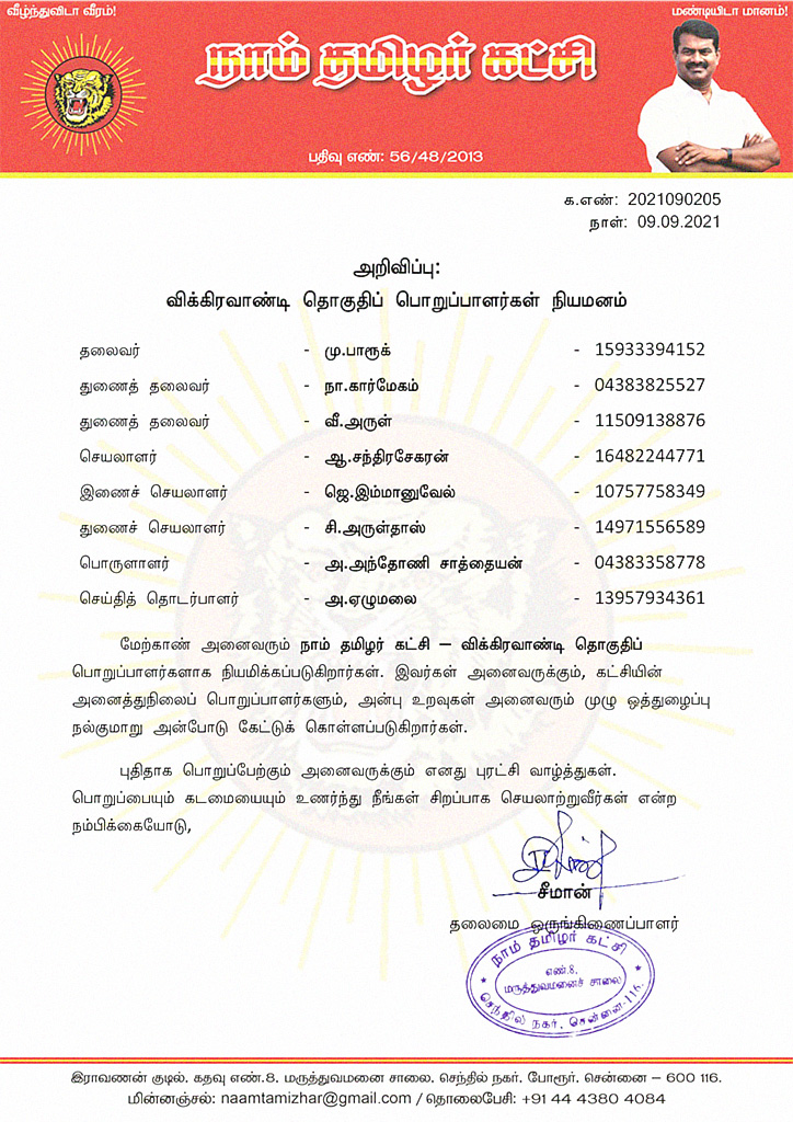 மேற்காண் அனைவரும் நாம் தமிழர் கட்சி – விக்கிரவாண்டி தொகுதிப் பொறுப்பாளர்களாக நியமிக்கப்படுகிறார்கள். இவர்கள் அனைவருக்கும், கட்சியின் அனைத்துநிலைப் பொறுப்பாளர்களும், அன்பு உறவுகள் அனைவரும் முழு ஒத்துழைப்பு நல்குமாறு அன்போடு கேட்டுக் கொள்ளப்படுகிறார்கள்.