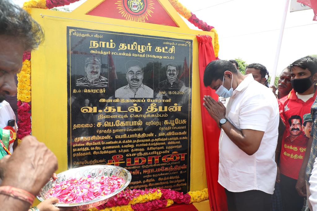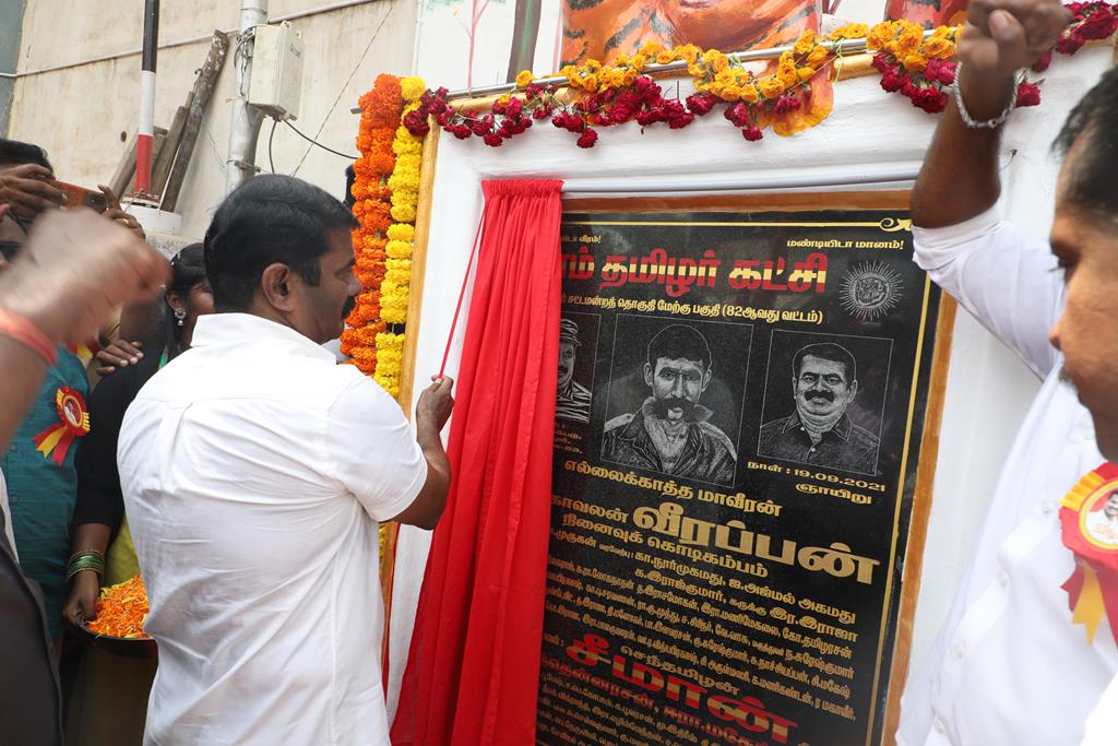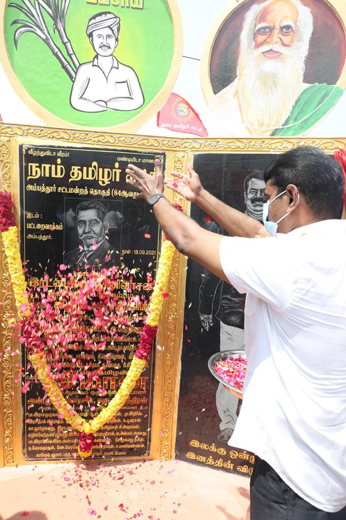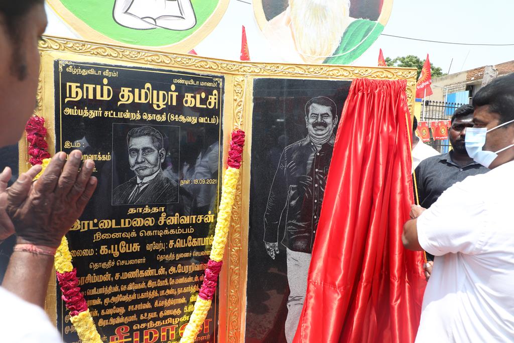 19-09-2021 அன்று அம்பத்தூர் தொகுதியில் மேற்கு பகுதிக்குட்பட்ட(82வது வட்டம்) மேனாம்பேடு கருக்கு விரைவுச்சாலை பாலம் அருகில் எல்லைக்காத்த மாவீரன் வனக்காவலன் வீரப்பனார் நினைவுக்கொடிக்கம்பம், பட்டறைவாக்கம் (84வது வட்டம்) பெரியகுளம் அருகில் சமூகநீதிப்போராளி தாத்தா இரட்டைமலை சீனிவாசனார் நினைவுக்கொடிகம்பம் மற்றும் கொரட்டூர் குழந்தை இயேசு ஆலையம் அருகில் தமிழ்த்தேசியப் போராளி வ.கடல்தீபன் நினைவுக்கொடிகம்பம் ஆகியவற்றில் நாம் தமிழர் கட்சியின் தலைமை ஒருங்கிணைப்பாளர் சீமான் அவர்கள், கல்வெட்டுக்களைத் திறந்து வைத்து, வானளாவ உயர்ந்த கொடிக்கம்பங்களில் புலிக்கொடியேற்றிவைத்தார். உடன், மாநில ஒருங்கிணைப்பாளர் அன்புத்தென்னரசன், இளைஞர் பாசறை மாநில ஒருங்கிணைப்பாளர் மகேந்திரன், அம்பத்தூர் தொகுதிச்செயலாளர் க.பூபேசு உள்ளிட்ட மாவட்ட, தொகுதி நிர்வாகிகள் பலர் பங்கேற்றனர்.