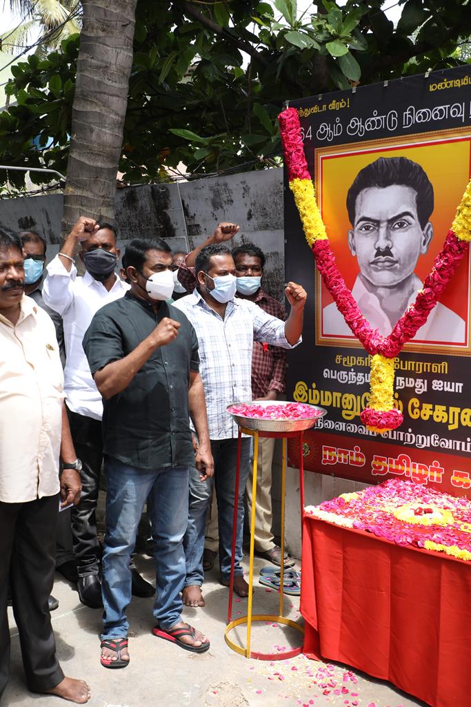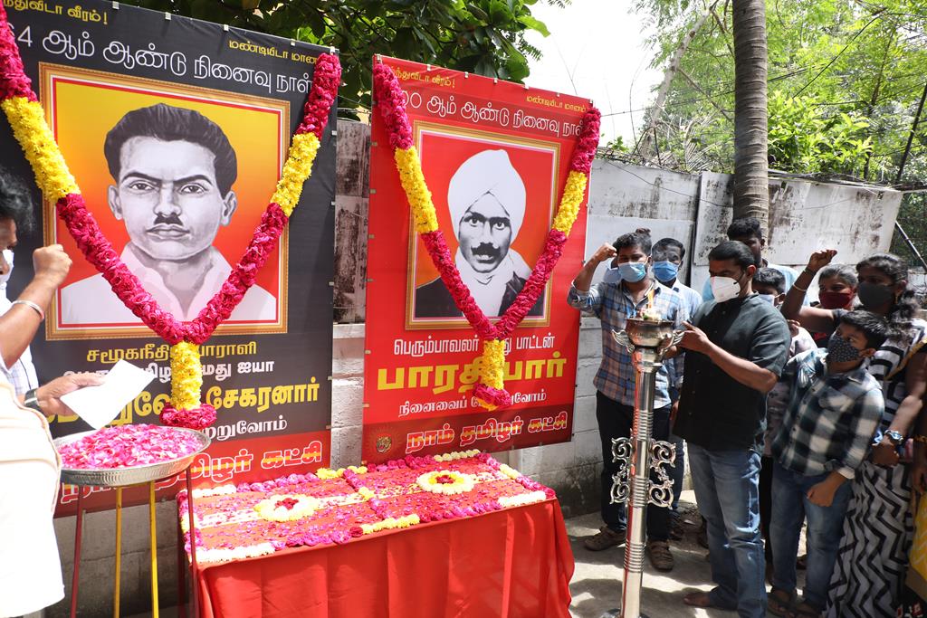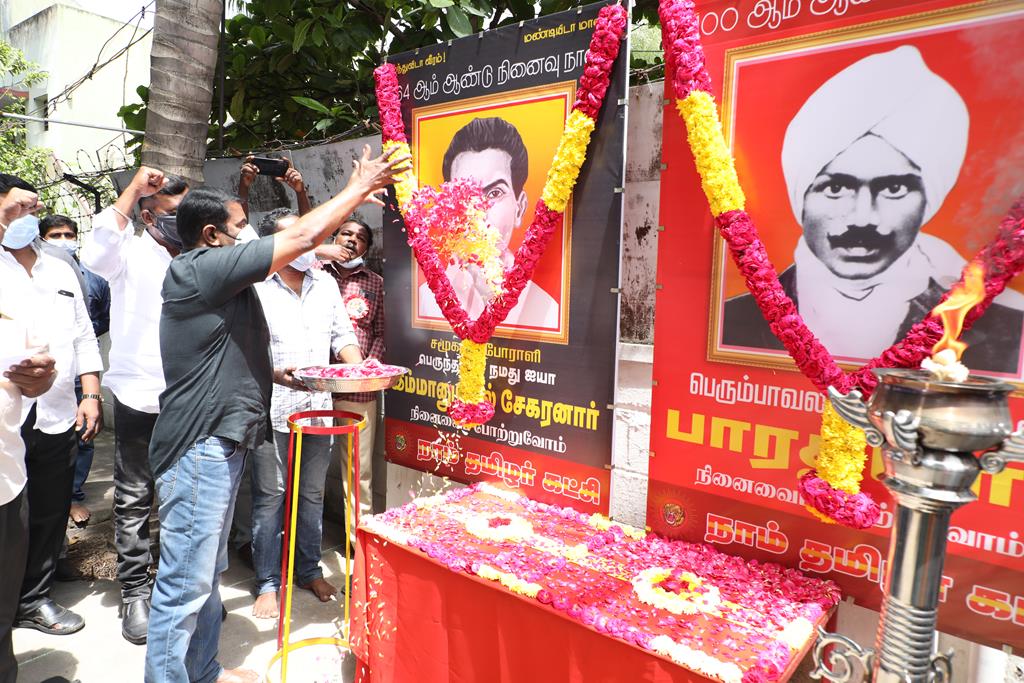 பெரும்பாவலர் பாரதியார் நூறாம் ஆண்டு நினைவுநாளும், சமூக நீதிப் போராளி இம்மானுவேல் சேகரனார் அறுபத்து நான்காம் ஆண்டு நினைவுநாளுமான 11-09-2021 அன்று, அவர்களின் நினைவைப்போற்றும் நிகழ்வு நாம் தமிழர் கட்சியின் தலைமை அலுவலகத்தில், தலைமை ஒருங்கிணைப்பாளர் சீமான் தலைமையில் நடைபெற்றது. மலர் மாலைகளால் அலங்கரிக்கப்பட்டிருந்த தமிழ்ப் பேராளுமைகள் இருவரின் திருவுருவப் படத்திற்கும் முன்னால் சீமான் அவர்கள், நினைவுச் சுடரேற்றி, மலர் வணக்கம், புகழ் வணக்கம் செலுத்தினார். உடன், நாம் தமிழர் கட்சியின் மாநில, மாவட்ட, தொகுதி நிர்வாகிகள் பலர் பங்கேற்றனர்.