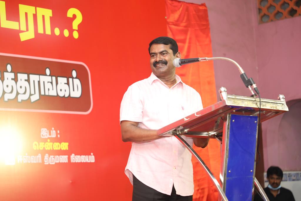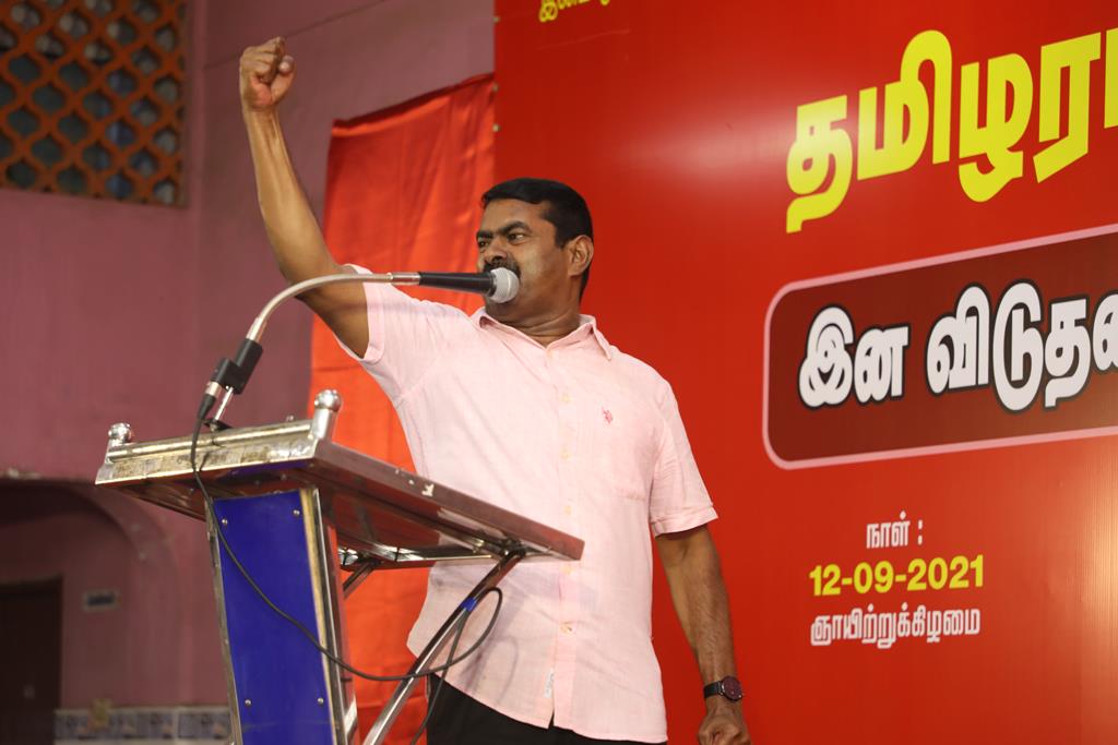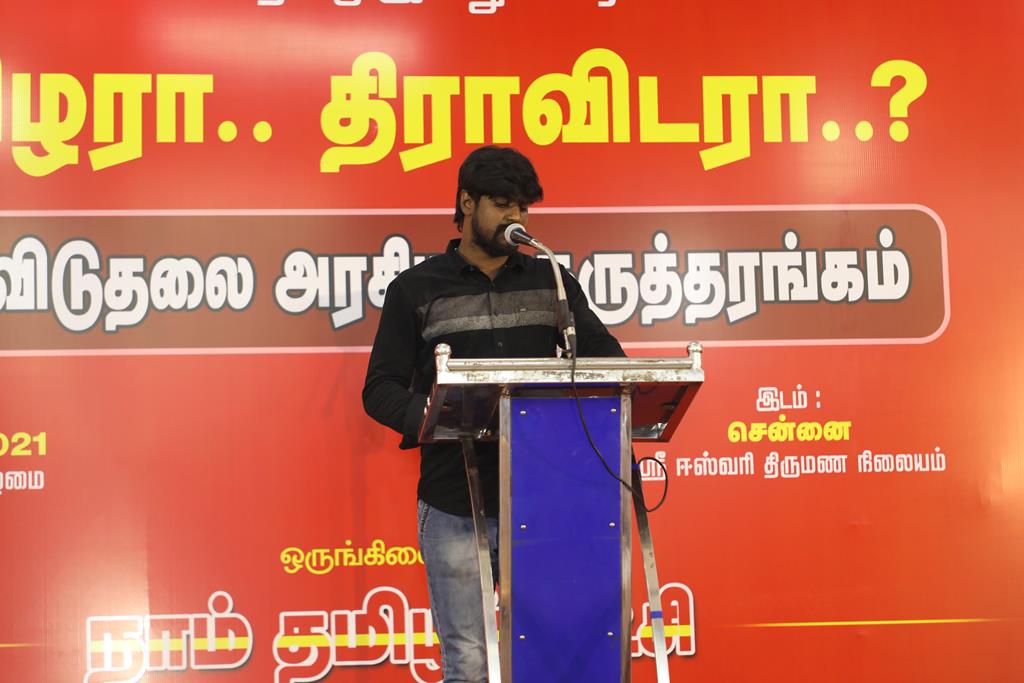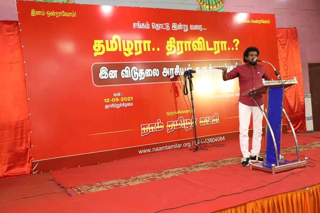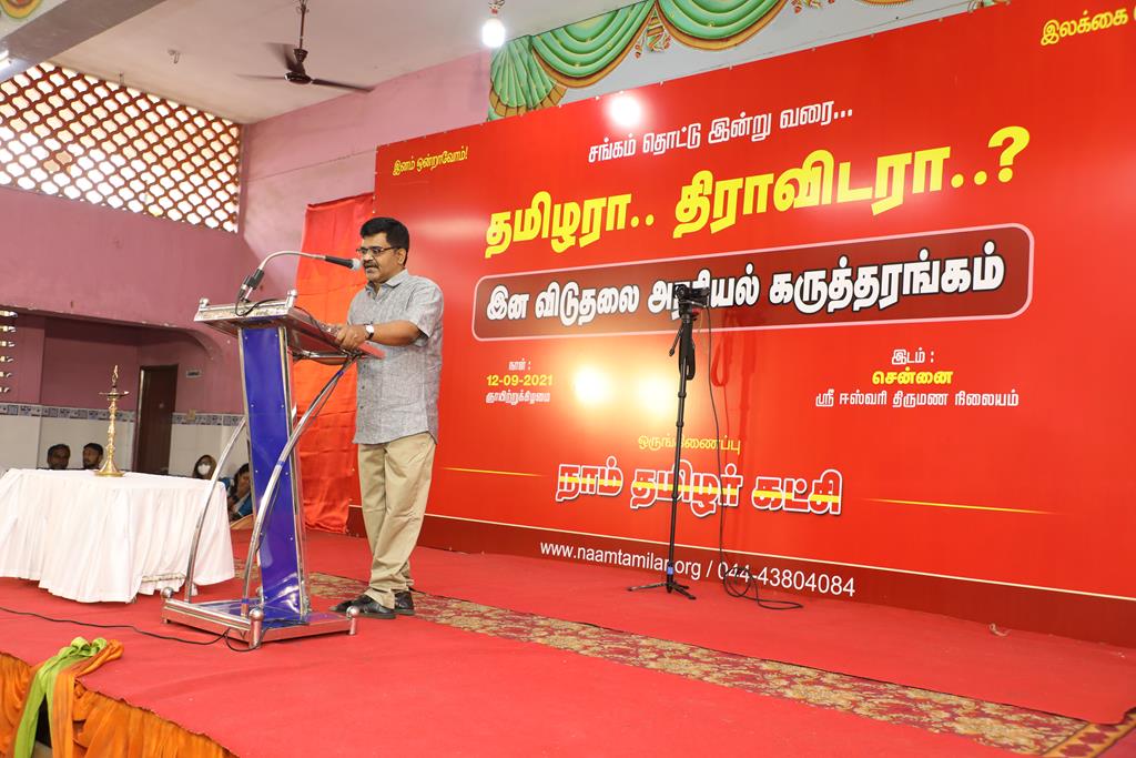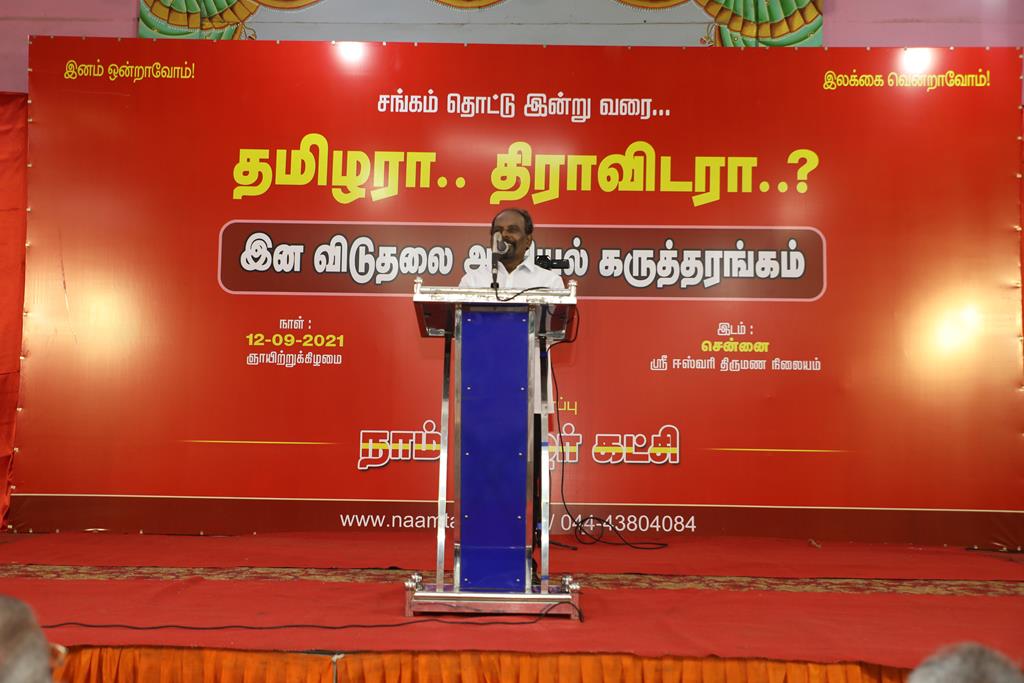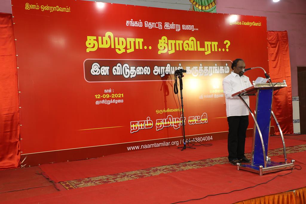 நாம் தமிழர் கட்சியின் ஒருங்கிணைப்பில் “சங்கக் காலம் தொட்டு.. தமிழரா.. திராவிடரா..?” என்ற தலைப்பில் இன விடுதலை அரசியலுக்கான முழுநாள் கருத்தரங்கம் 12-09-2021 அன்று, காலை 10 மணி முதல் இரவு 07 மணிவரை முழு நாள் நிகழ்வாக, சென்னை போரூர் மேம்பாலம் அருகில் அமைந்துள்ள ஸ்ரீ ஈஸ்வரி திருமண நிலையத்தில் நடைபெற்றது.