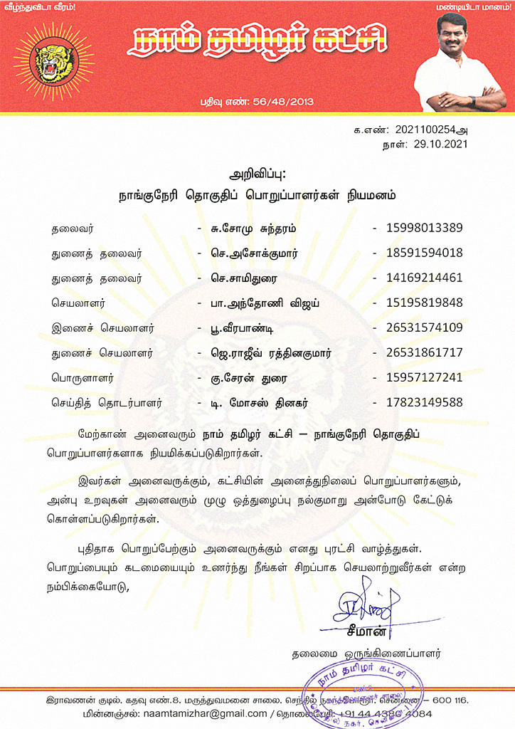 மேற்காண் அனைவரும் நாம் தமிழர் கட்சி – நாங்குநேரி தொகுதிப் பொறுப்பாளர்களாக நியமிக்கப்படுகிறார்கள்.