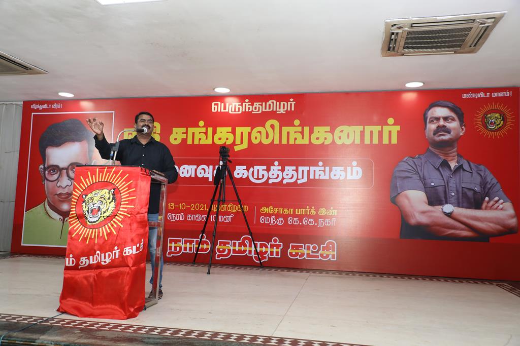 தமிழ்நாடு என்று பெயர் வைக்கக்கோரி 76 நாட்கள் பட்டினிப் போராட்டம் இருந்து உயிர்நீத்த பெருந்தமிழர் ஈகி சங்கரலிங்கனாரின் 65ஆம் ஆண்டு நினைவுநாளையொட்டி, “தேசிய இனங்கள் எதிர்கொள்ளும் சிக்கல்களும்; அதற்கான தீர்வுகளும்!” என்ற தலைப்பில் நாம் தமிழர் கட்சி ஒருங்கிணைத்த நினைவுக் கருத்தரங்கம் சென்னை, மேற்கு கே.கே.நகர் அசோகா பார்க் இன் அரங்கத்தில் நடைபெற்றது.