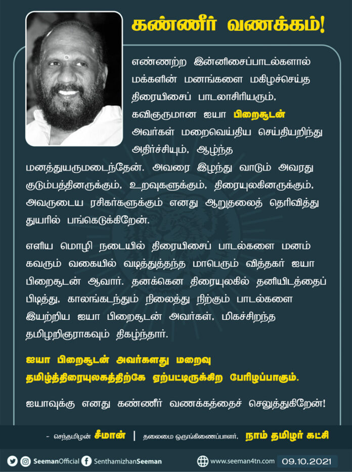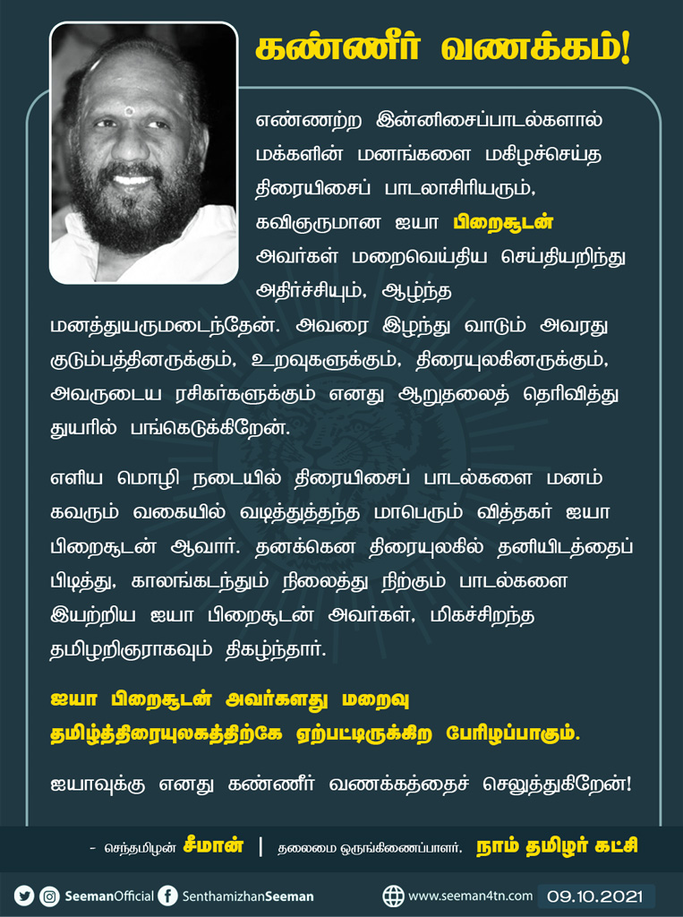 திரையிசைப்பாடலாசிரியர் பிறைசூடன் மறைவு தமிழ்த்திரையுலகத்திற்கே ஏற்பட்டிருக்கிற பேரிழப்பு! – சீமான் புகழாரம்