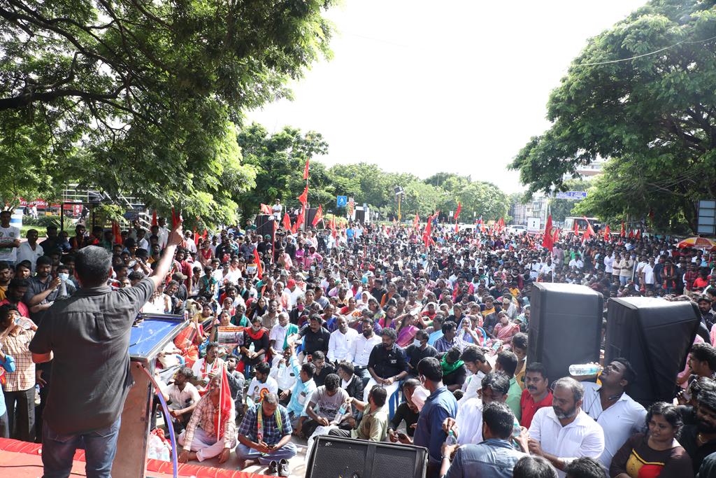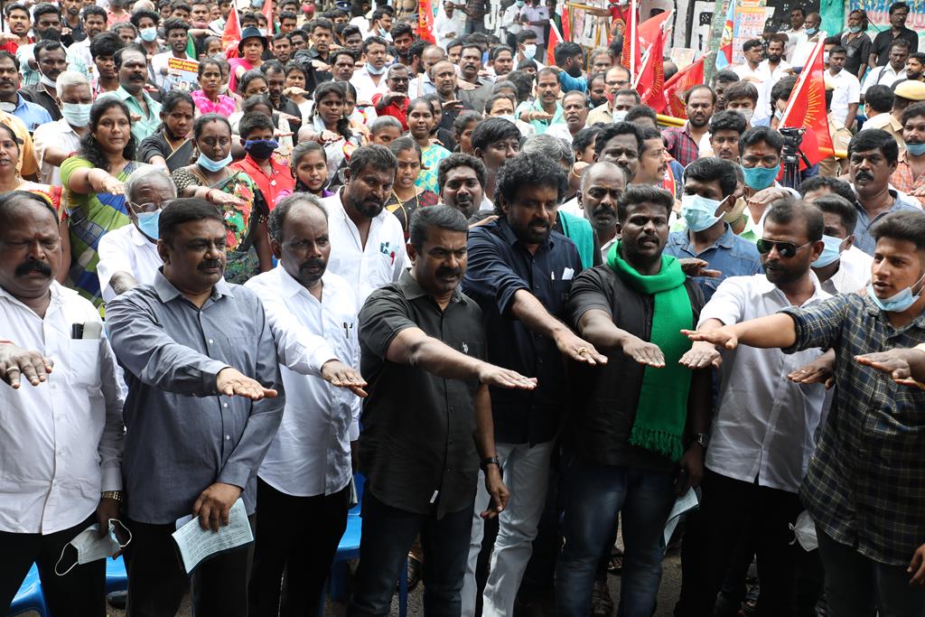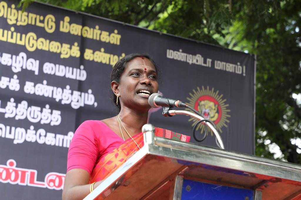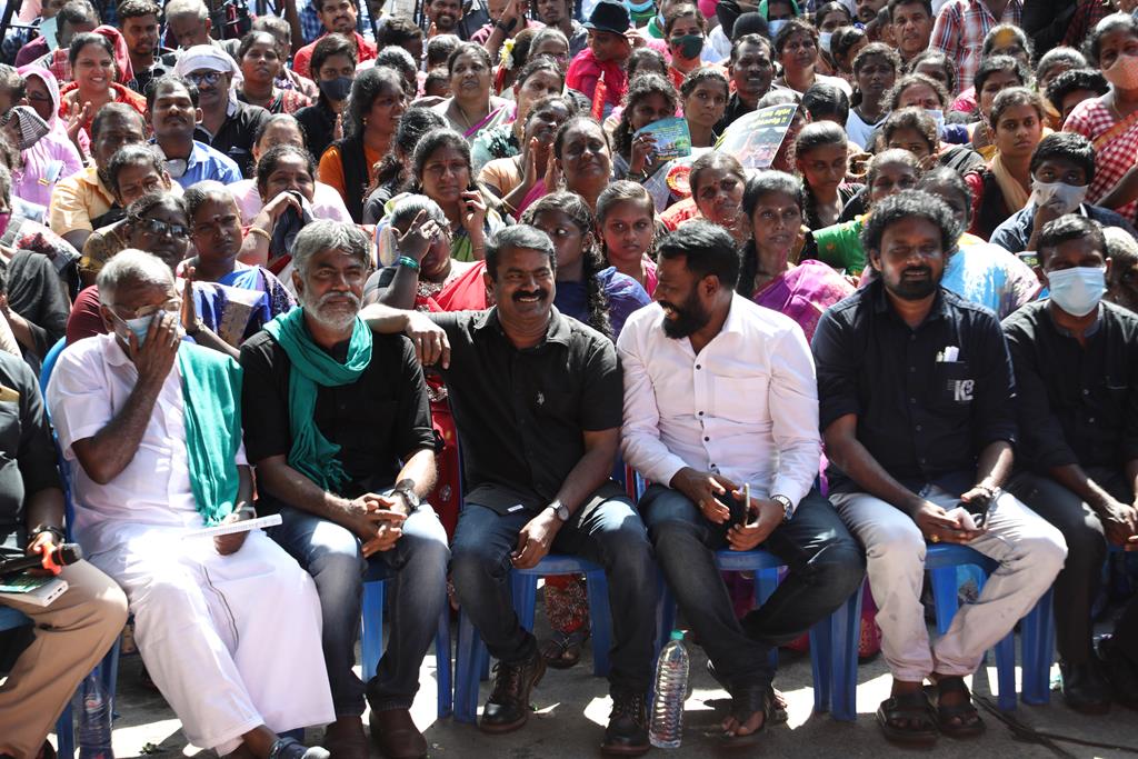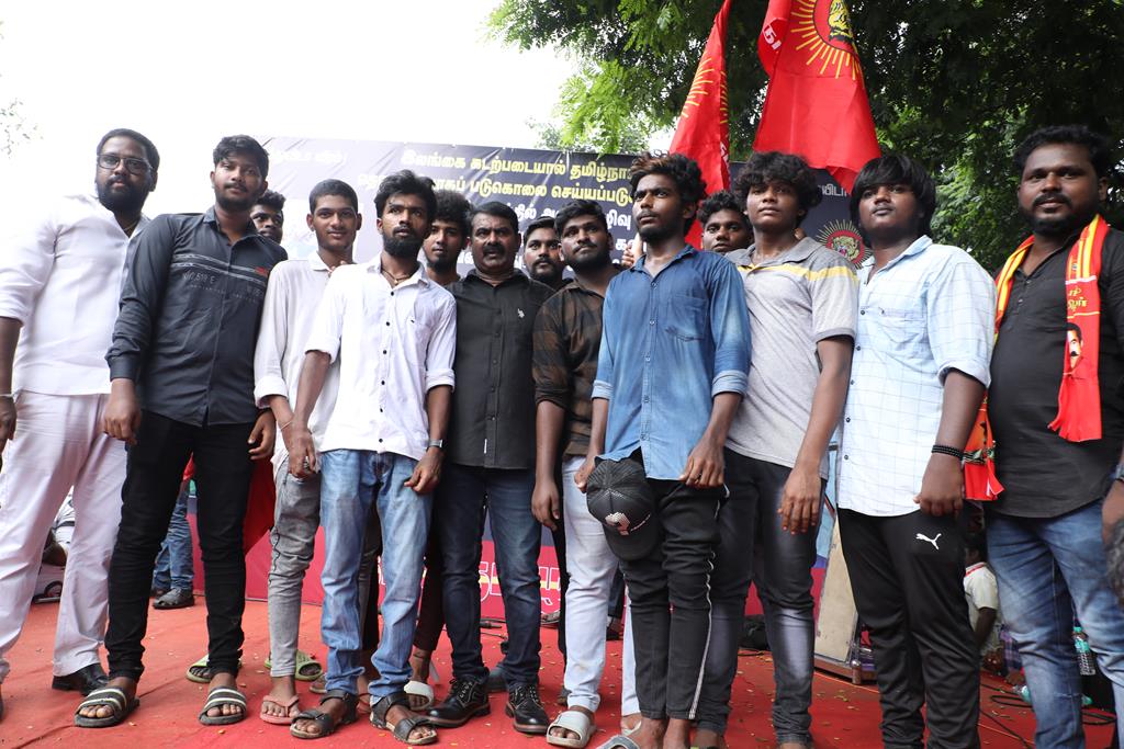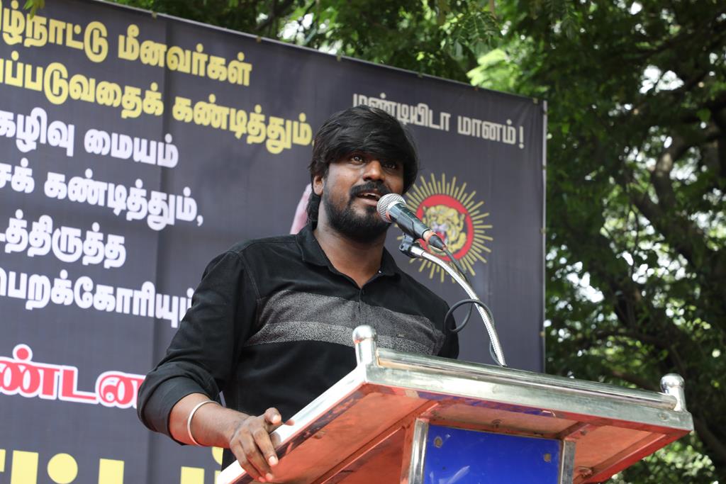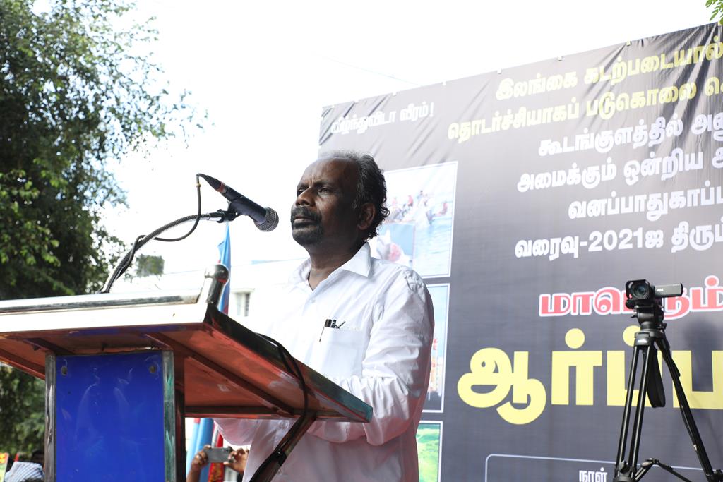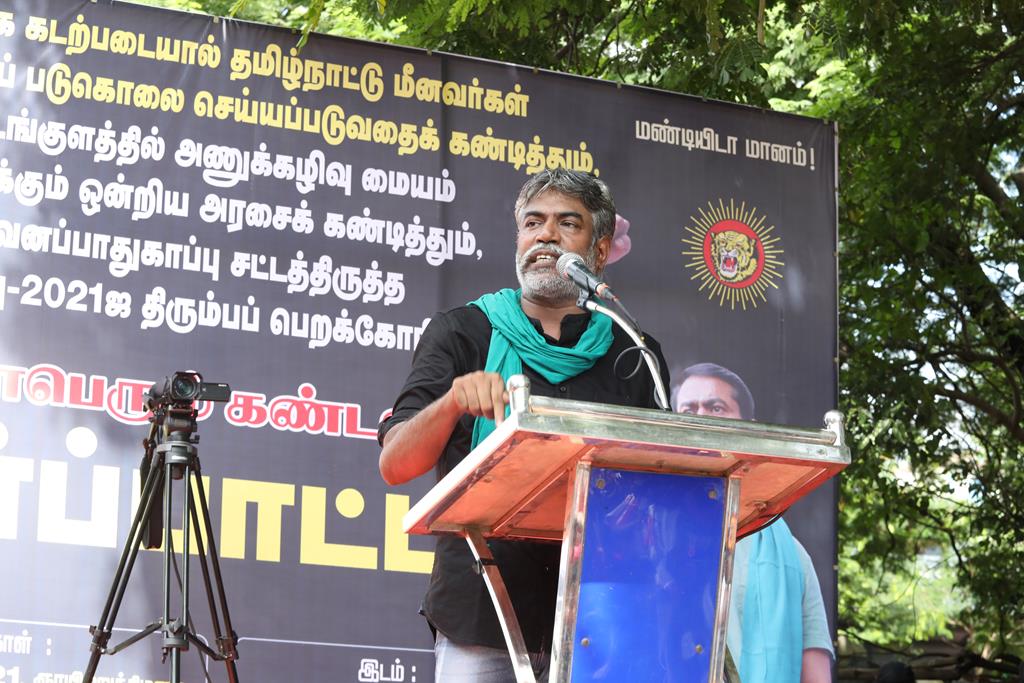 நாம் இங்கு மூன்று சிக்கல்களுக்காக ஒன்றுகூடி ஆர்ப்பாட்டம் செய்துகொண்டிருக்கிறோம். தொடர்ச்சியாக நமது இன உறவுகளான மீனவச்சொந்தங்களை இலங்கைக்கடற்படை சுட்டுக்கொல்வதை வாடிக்கையாக வைத்திருக்கிறது. அதற்கு அவர்கள் சொல்கிற காரணம், எல்லைத்தாண்டிச் செல்கிறோம் என்பதுதான். அப்படியென்றால், இந்தியக்கடல்படை இராணுவம் எல்லையில் நிறுத்தி வைக்கப்பட்டு, ‘இத்தோடு திரும்புங்கள்’ என மீனவர்களுக்கு அறிவுறுத்தியிருக்க வேண்டியதுதானே? அதனை ஏன் செய்யவில்லை? உலகின் வலிமைமிக்க கடற்படை இராணுவங்களுள் ஒன்றான இந்தியக்கடற்படை கடலுக்குள் யாரிடமிருந்து யாரைப் பாதுகாக்க வேலைசெய்கிறது? சொந்த நாட்டுக்குடிகளில் 850 க்கும் மேலான மீனவர்களைச் சுட்டுக்கொன்றிருக்கிறது இலங்கைக்கடற்படை. இதுகொலை செய்தது மட்டும்தான்; படகைப் பறித்தது, அடித்துத் துரத்தியது, சித்ரவதை செய்தது, வலையைக் கிழித்தது, சிறைப்படுத்தியது இதுவெல்லாம் தனி. என்றைக்காவது சிங்களக்கடற்படை தமிழக மீனவர்களைச் சிறைபிடிக்க வரும்போது அல்லது தாக்க வரும்போது இந்தியக்கடற்படை இராணுவம் தடுத்து அவர்களைக் காப்பாற்றியது எனும் செய்தியை எவராவது கேள்விப்பட்டதுண்டா? இல்லை! அப்புறம், எதற்காகக் கடற்படை இராணுவம்? தம்பி ராஜ்கிரணுக்குத் திருமணமாகி 40 நாட்கள்தான் ஆகிறது. அவனை அடித்துக்கொலைசெய்து, அவன் மீது எரிதிரவத்தை ஊற்றியிருக்கிறார்கள். அவன் இறந்தப்பிறகும்கூட, அவனைவிடுவதற்கு சிங்களக்கடற்படையினருக்கு மனமில்லை. என்னவொரு குரூரமான மனநிலை? எவ்வளவு வன்மம்? நாங்கள் எல்லைத்தாண்டிச் செல்வதாகக் குற்றஞ்சாட்டுகிறார்கள். அருகாமையிலிருக்கும் கேரள மீனவர்கள் எல்லைத்தாண்டிச் செல்வதில்லையா? செல்கிறார்கள்! ஆனால், எல்லைத் தாண்டிச்சென்றாலும் கேரள மீனவனை சிங்கள இராணுவம் ஒருபோதும் தொடுவதில்லை; எல்லைத்தாண்டவில்லையென்றாலும், தமிழர்களைத் தாக்குகிறார்கள். காரணம், சிங்களர்களின் ஆழ்மனதிலிருக்கிற தமிழர்கள் மீதான வன்மம். எங்கள் தம்பிகள் தாங்கள் அனுபவித்தக் கொடுமைகளைக் கதை கதையாகக் கூறுவார்கள்.
